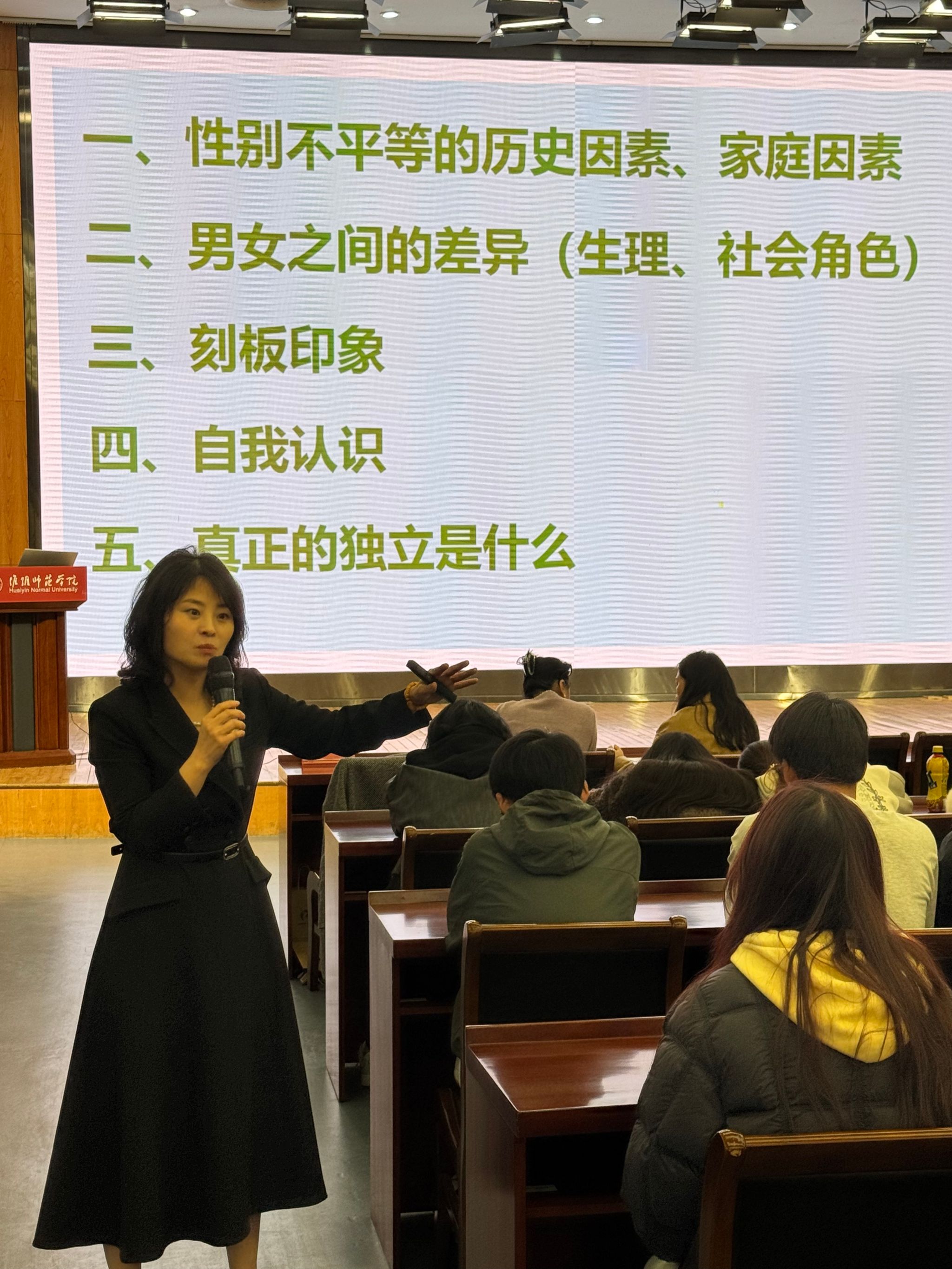 李金晏博士积极倡导“性别平等”,她以生动案例阐释了性别刻板印象的负面影响,鼓励女性打破外界束缚,勇敢追求自我价值。她提出:“性别平等不是单方面的努力,而是需要男女携手共建。”早在讲座开讲前,李金晏老师就积极呼吁男同学也参与讲座。她表示,要“构建起两性相互理解、平等协作的校园文化,让尊重与关爱成为双向流动的力量”。