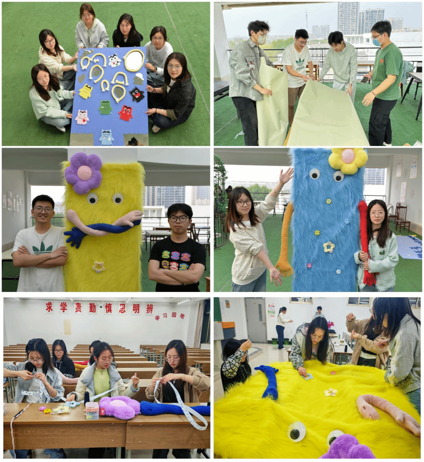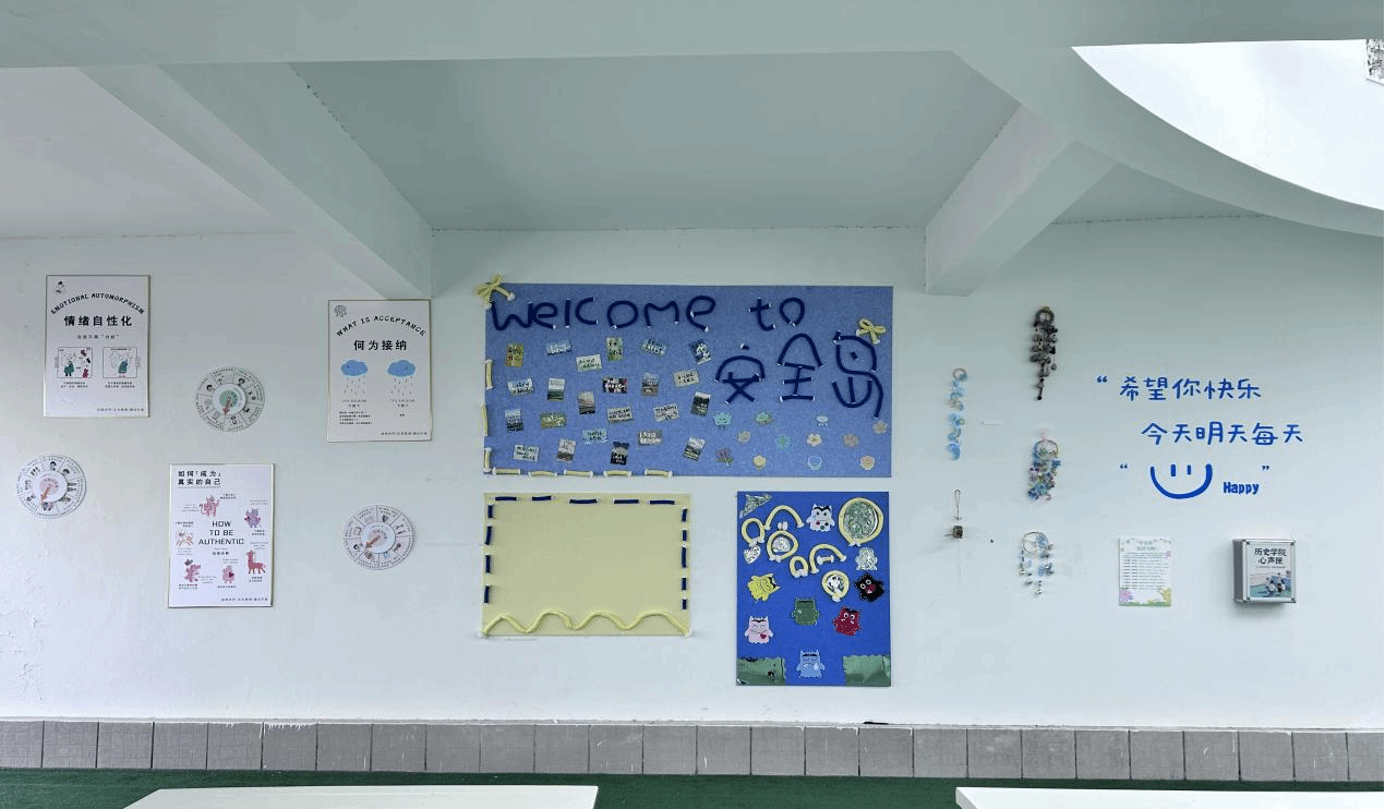 改造后的天台也呈现多个特色区域:一对拥抱柱成为温暖象征,鼓励同学以拥抱传递情感;雅致桌贴装点课桌,为学习环境增添活泼氛围;情绪转盘与哈哈镜,借趣味互动引导同学正视、调节情绪;色彩斑斓的毛毡画、富含深意的心理装饰画,点缀各处,传递心灵关怀;心声匣则静静伫立,收纳大家的秘密与心声……
