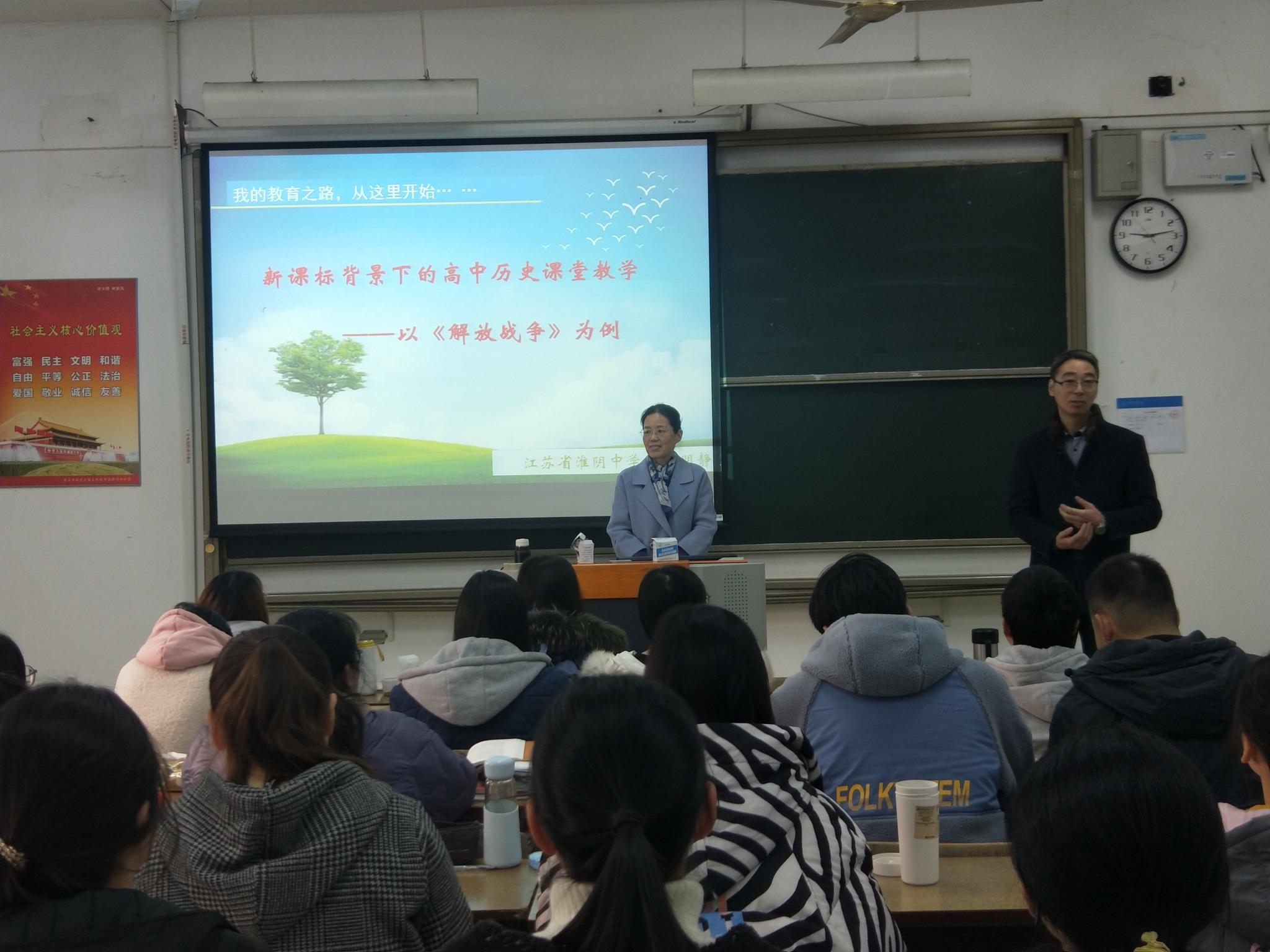 2019年12月12日上午,全国优秀教师、江苏省淮阴中学高级教师詹明静在崇文1-106教室为1701班同学开设了题为《新课标背景下高中历史课堂教学——以<解放战争>为例》的专题讲座。讲座由教师教育公司刘中猛博士主持。