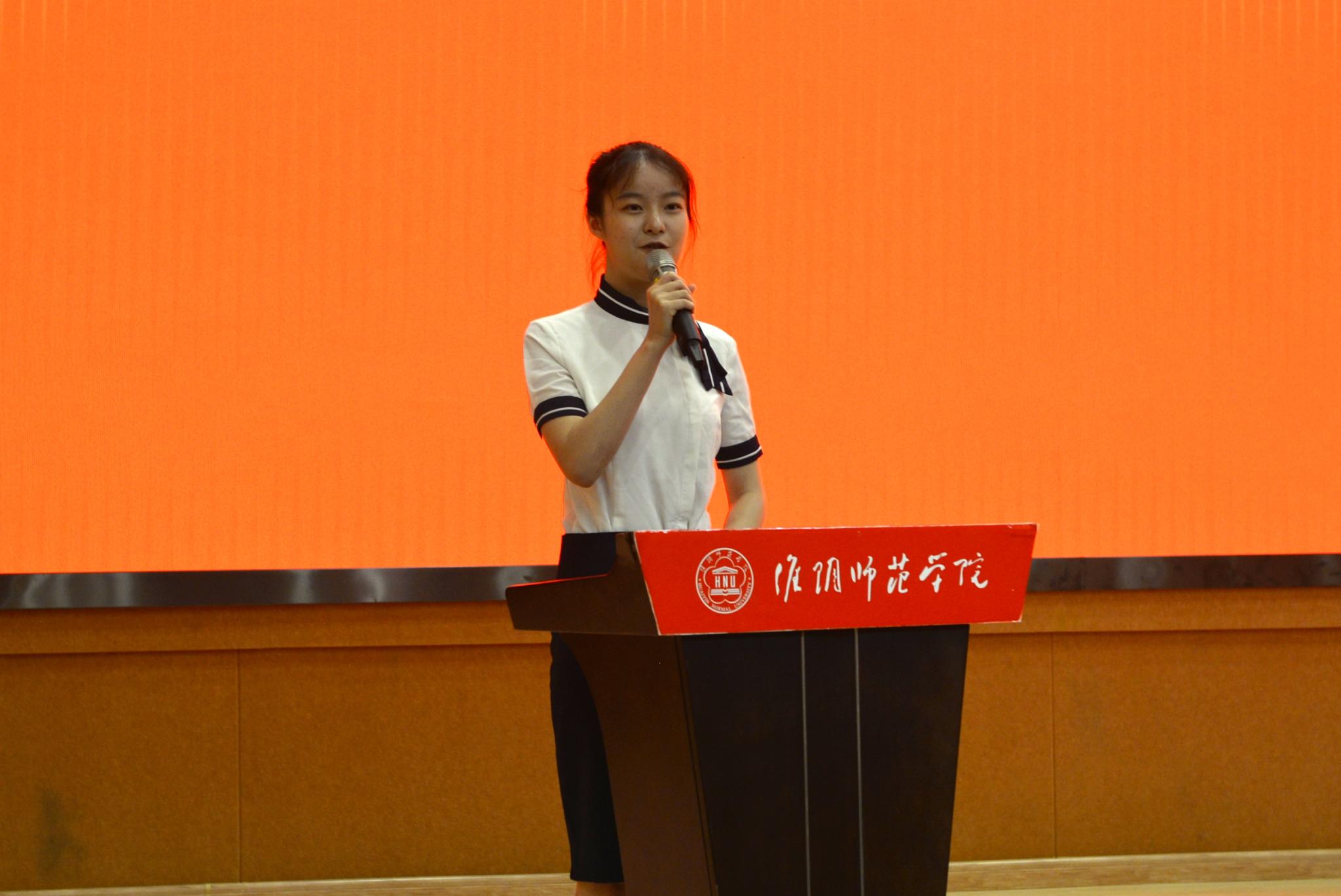 随后,来自1904班的喻纪欣代表新生进行了发言。她以相聚、青春、筑梦为主题发表了演讲,希望同学们不忘初心,砥砺前行,用正能量筑起自己心中的梦,她同时表示自己将不畏艰难险阻,脚踏实地,用智慧、勇气和永不服输的心,向着每一座山峰勇敢攀登。