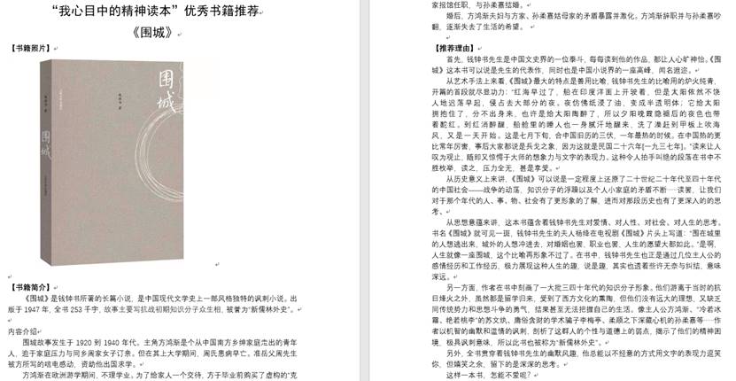 内涵丰富的精神读本像是一架架桥梁,沟通心灵,纯净灵魂,也通往爱与梦的远方。 “我心目中的精神读本”优秀书籍推荐的参赛者推荐的大多数是文学小说,例如:海伦·凯勒的《假如给我三天光明》;钱钟书的《围城》;老舍的《我这一辈子》等,当然也有治愈微籍《一切所遇,欢迎光临》等。书种类繁多,风格多样,都是充满着启迪意义的精神读本。同学们在此次交流比赛中分享了自己心爱的书籍,增长了见闻。