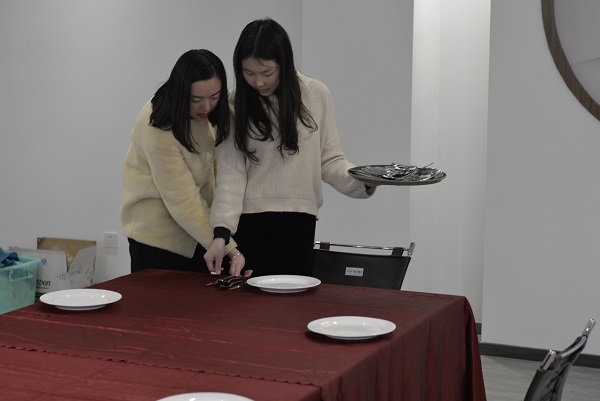公司参赛的选手共分为四个项目组,分别是:中式铺床、开夜床;中餐宴会摆台;西餐宴会摆台和鸡尾酒调制。每天的课余时间,选手们都在实训室中紧锣密鼓地积极备赛。指导老师们也从旁指导,对选手在练习中出现的不足提出建议,为大家做出详尽点评,力求完美。指导老师提醒选手,在平时的训练过程中要学会思考、学会发现问题,并及时解决问题,这样才能做到有所思、有所想、有所获,从而走向成功。