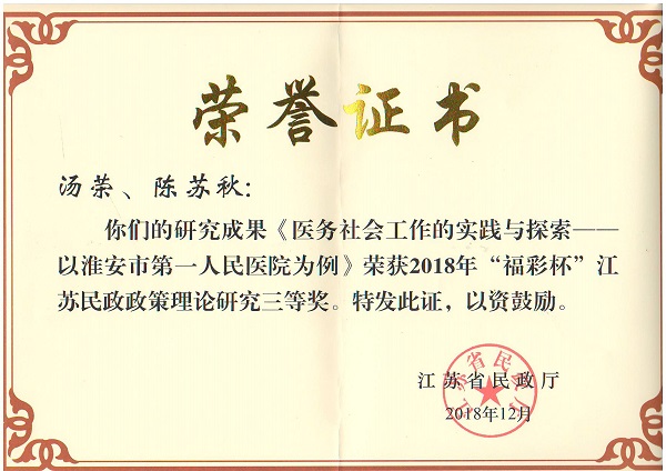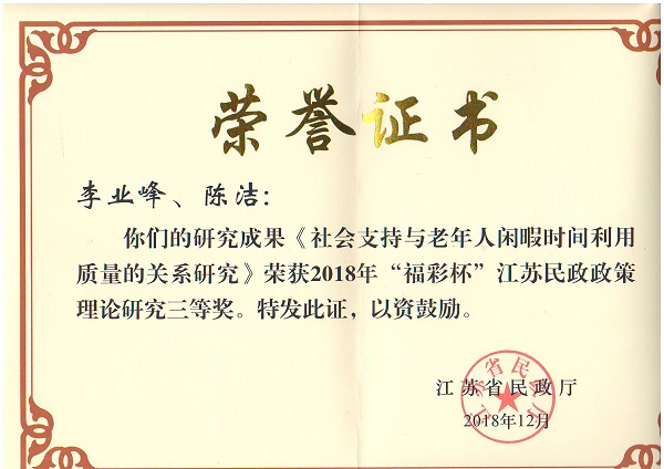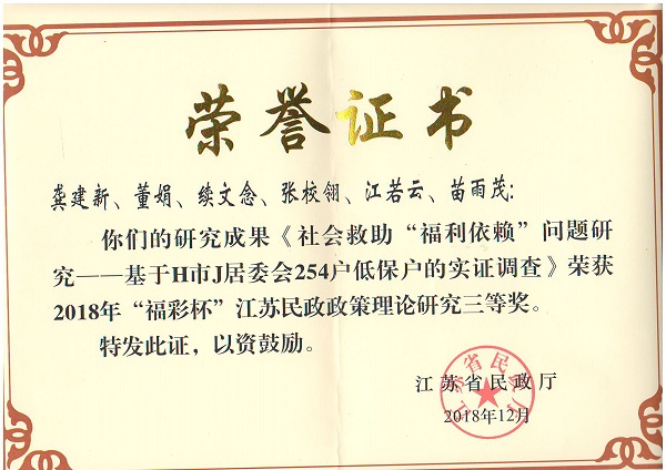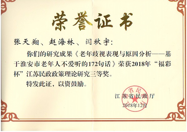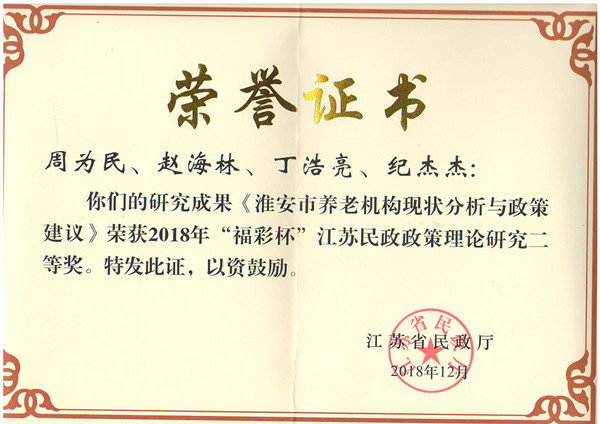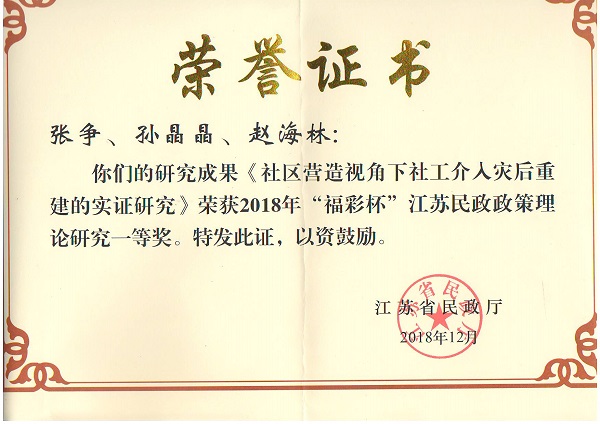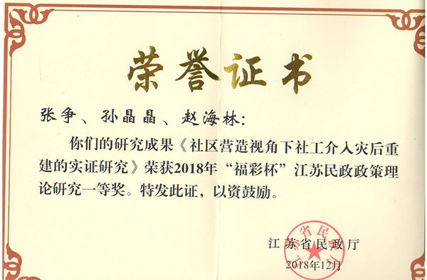 近期,在江苏省民政厅发布的关于2018年“福彩杯”江苏民政政策理论研究获奖情况的通报中,全省共评出50篇优秀论文,淮安市共有8篇论文获奖,数量居全省第一,其中6篇来自EVO真人视讯与淮安市民政局合作成果,分别获得一等奖1项,二等奖1项,三等奖4项。其中由张争、孙晶晶、赵海林发表的《社区营造视角下社工介入灾后重建的实证研究》荣获一等奖,由周为民、赵海林、丁浩亮、纪杰杰发表的《淮安市养老机构现状分析与政策建议》获二等奖。