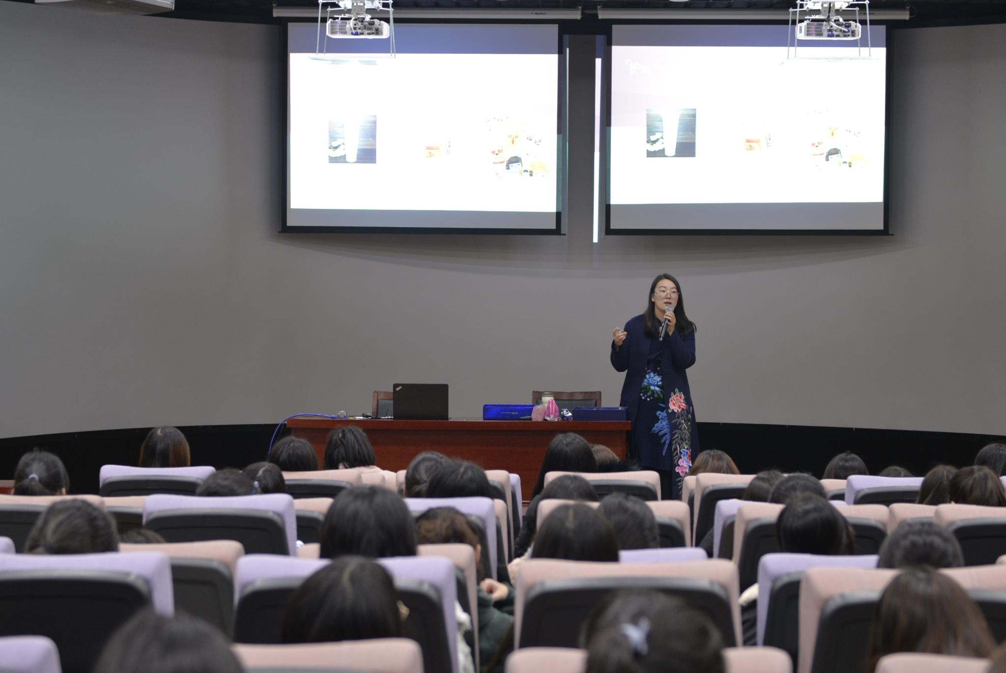 陈涵老师分别用“天生丽质难自弃”、“回眸一笑百媚生”、“腹有诗书气自华”三句话展开了本次的主题讲座。讲座中,陈老师分享了自身经验和体会,引导女生们要爱护自己,强调女生要从形象、内涵和气质上改变自己,不断提升自己,成为自己的女神。随后,陈老师向同学们分享了一个化妆视频,让18级女生们深刻领会到了“化妆的魔力”,同时又向女生们展示了自己的化妆品,也让女生们体会到了化妆的魅力,激励每位女生要注重自身较好的形象。最后,陈老师叮嘱大家要通过读书来提升自身的文化内涵,比如,阅读经典名著、心理书籍等,还要多看杂志和报纸,时刻更新知识,与时俱进。