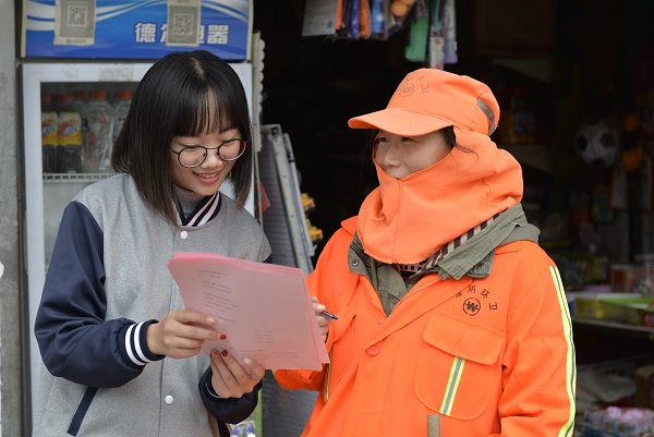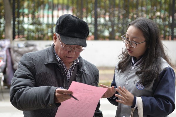 在社区黄书记的介绍下,志愿者大致了解了本社区创建工作的进程和特色项目。志愿者们分工明确,一组进行问卷调查,一组进行政策宣讲。负责问卷调查的同学邀请社区居民填写相关问卷,以了解居民对文明城市创建工作的了解情况,同时收集大家对相关工作的建议和意见。在填写问卷的过程中,志愿者对问卷进行了认真细致的讲解,以解答居民提出的问题。