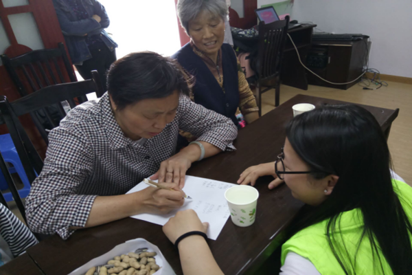 (图为志愿者指导老人填写资料 胡雪妮摄)