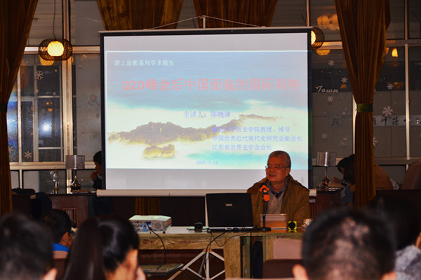 11月14日下午,南京大学博士生导师、江苏世界史学会会长、中国世界近现代史研究专家陈晓律教授应邀来EVO真人视讯,作题为“G20峰会后中国面临的国际局势”学术报告。EVO真人视讯李巨澜经理主持报告会。 陈晓律教授以全球化的眼光详细剖析了G20峰会顺利召开后中国周边国家的历史和现状,指出中国召开G20会议是影响国际关系的一件大事,在未来的全球治理中,中国将以更加积极有为的姿态参与进去,改善与世界的关系,改善国际体系中存在不公正、不合理、效率低下等问题,致力于成为世界秩序的建设者,进而在国际关系的纵横捭阖中实现“双赢”和“共赢”。 报告会结束后,陈晓律教授还与现场师生进行了互动交流,就特朗普当选新一任美国总统等当前热点话题发表了自己的见解。EVO真人视讯部分师生参加了报告会。