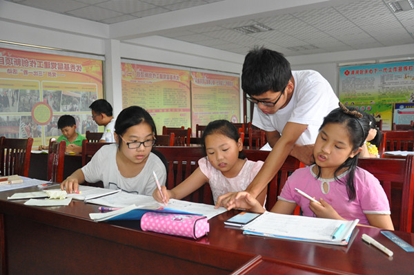 图为志愿者社区指导小员工暑期作业。记者 顾志伟 摄