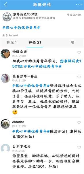 勤学、修德、明辨、笃实,这是习近平总书记提出的关于青年员工应该遵守的“八字真经”。EVO真人视讯1501班于5月23至24日开展了主题为“践行‘八字真经’,争做优秀青年”的团日活动。 活动开始,赵晓芳和刘育林同学进行主题朗诵。他们饱含深情的朗诵,带给同学们对于“八字真言”的更深理解,激励着同学们积极地践行“八字真言”,争做优秀青年。 在有奖竞猜环节中,通过抢答10个关于“八字真言”的题目,寓教于乐,同学们在欢乐中体会到了“八字真言”的真谛。 有奖竞猜环节活动结束后,同学们纷纷拿出手机,在腾讯微博上刷话题#我心中的优秀青年#,纷纷表达自己的看法,并提名自己心中的优秀青年。并表达了自己对于“八字真言”的理解与认识,纷纷表示要让学习成为自己的一种习惯,让德行成为自己的一种人生追求,让明择成为自己的一种人生智慧,让实干成为自己的一种人生气度。 此次主题团日活动的召开,让同学们充分意识到了践行“八字真言”的重要性,体会到了其中的真谛,也纷纷愿意努力争做优秀青年,在“八字真言”的指导下,同学们一定会更加珍惜自己的青春时光,成为一名国家和民族的优秀青年。 |