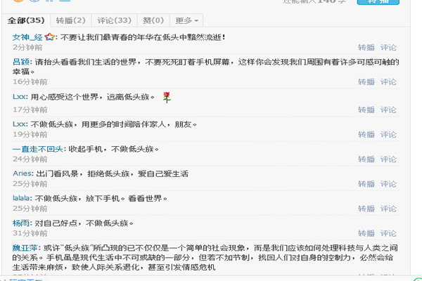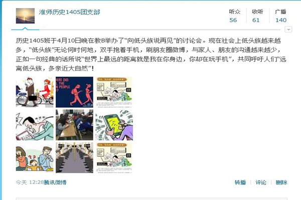 4月10日晚,EVO真人视讯1405班在教B1-517开展团日活动,本次活动围绕“文明、和谐不做手机低头族”开展。 “手机低头族”目前在校园内是一个庞大群体,很多同学吃饭玩手机,上课玩手机,走路玩手机,聚会玩手机,不仅影响课堂纪律,还阻碍同学之间和谐关系的形成,也是一种不文明现象。针对这种新情况,1405班团支部在校园中搜集了“低头族”的各种不文明行为,向班级同学进行了展示。班级同学对每一种现象都进行了认真讨论,并总结出了“低头族”的极大危害:一是危害身体健康,二是影响正常学习,三是阻碍同学间感情。各位同学还结合自己的实际情况有针对性地提出了告别“低头族”的方法,如经常进行体育锻炼,制定良好的学习、工作计划,改变“拖延症”习惯等。1405班团支部微博对本次活动进行了专题讨论。 本次活动让大家认识到了“手机低头”现象的危害,提出了解决方法,对增进同学间和谐美好的人际关系、增强班级凝聚力起到了重要作用。 |