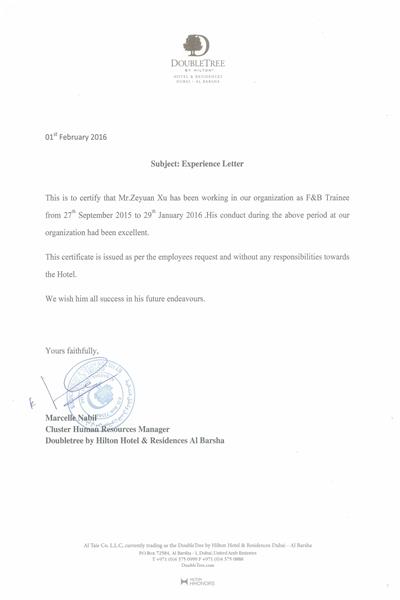 2016年1月29日,徐泽元同学成功结束了在迪拜为期近四个月的实习。他,因英语口语好、专业技能佳、服务意识强等优势,在希尔顿的层层选拔中脱颖而出,获得去该酒店实习的机会。实习期间,吃苦耐劳的他,能迅速适应各种工作环境,他出色的表现,赢得了酒店一致好评。在希尔顿给他的工作证明中,集群人力资源经理对他的评价是“excellent”。这一词汇表达了酒店方面对他付出的认可及赞赏。实习作为大学的一个分水岭,最宝贵的收获,莫过于实习点对自己付出的认可。无论是工作的开始,还是结束,徐泽元同学都很好的诠释了作为一名淮阴师范员工应有的担当。