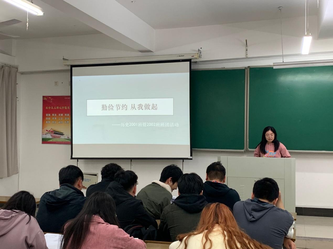 (4)勤俭节约主题班会:1903班围绕“五个一”——节约一度电、一滴水、一张纸、一粒米,向大家展示了一组浪费的数据,介绍了当今浪费粮食、水资源、电、物品的情况,触目惊心的数字让同学们深刻地意识到在日常生活中我们不经意的浪费会对生活造成很大的影响;1904班由团支书讲述周恩来总理勤俭生活的故事,激励并要求同学们将节俭贯彻于自身生活中;1905和1906班都通过分享一些勤俭节约的小故事或者生活中所存在的一些浪费现象,提出勤俭节约的重要性,呼吁从小事做起,共创节约型校园;2001与2002班以“勤俭节约,从我做起”主题,联系生活实际,提醒同学们提高自觉意识;2003班陆强同学朗读了《丰收不是浪费的理由》,带领大家了解节约的意义及其含义,带领同学们品读朱元璋、苏轼等古人有关勤俭节约的故事并利用相关数字与图片,让同学们深刻感受到勤俭节约的精神及其必要性,形成“厉行节约、反对浪费”的良好风尚;2006班邀请同学们分享自己的勤俭节约小妙招,提高节俭的意识,扩大宣传面,旨在帮助同学们争做有理想,有追求,有担当,有作为,有品质,有修养的六有青年。