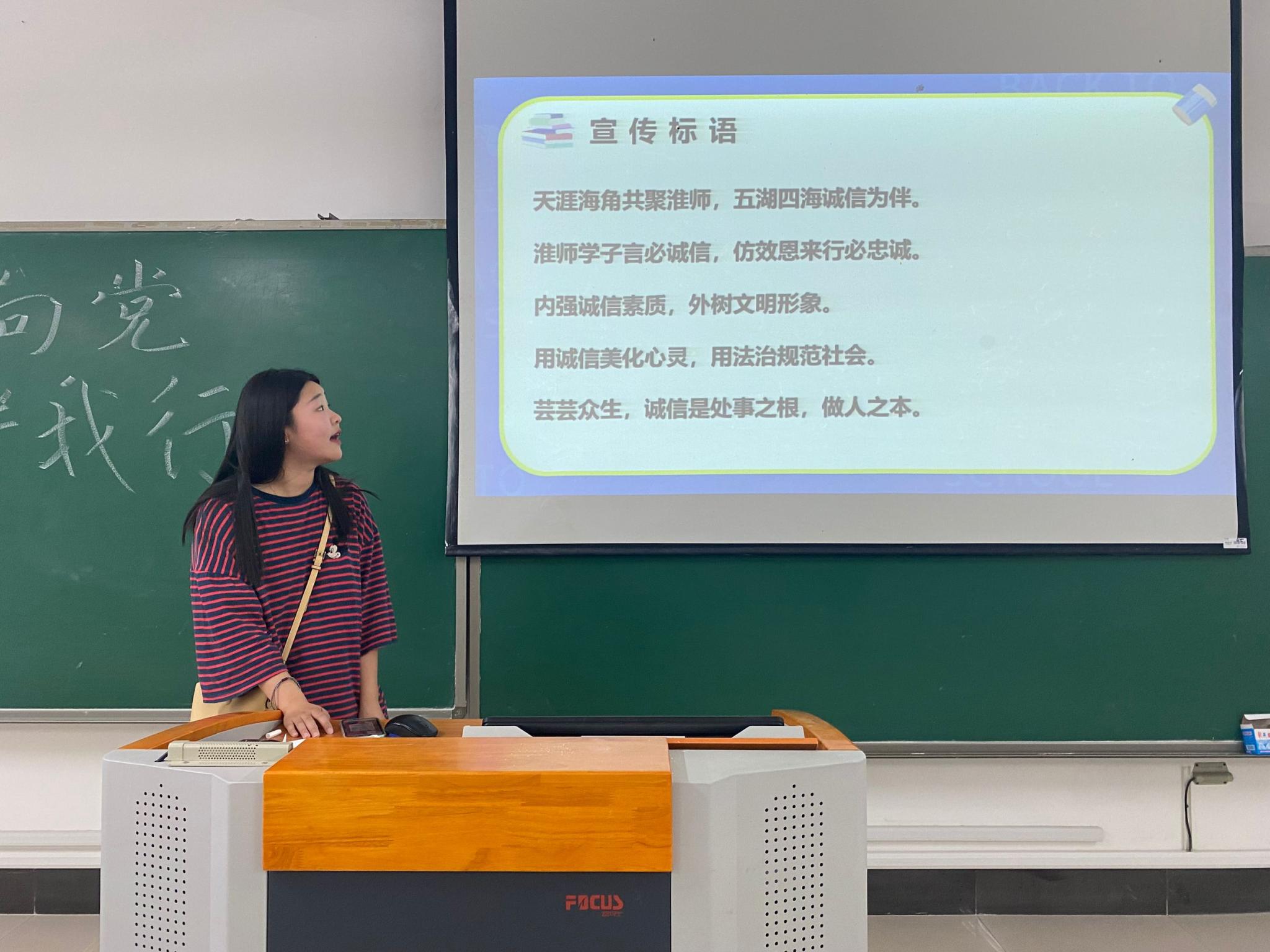 首先,陆强同学向大家介绍活动开展目的,通过一段诚信视频让大家初步了解诚信的意义与重要。带领大家学习了解古代很多诚信的人物与事例,如:“一诺千金”的季布,“立木而信”的商鞅等;同时,也向大家介绍了不诚信的事例。