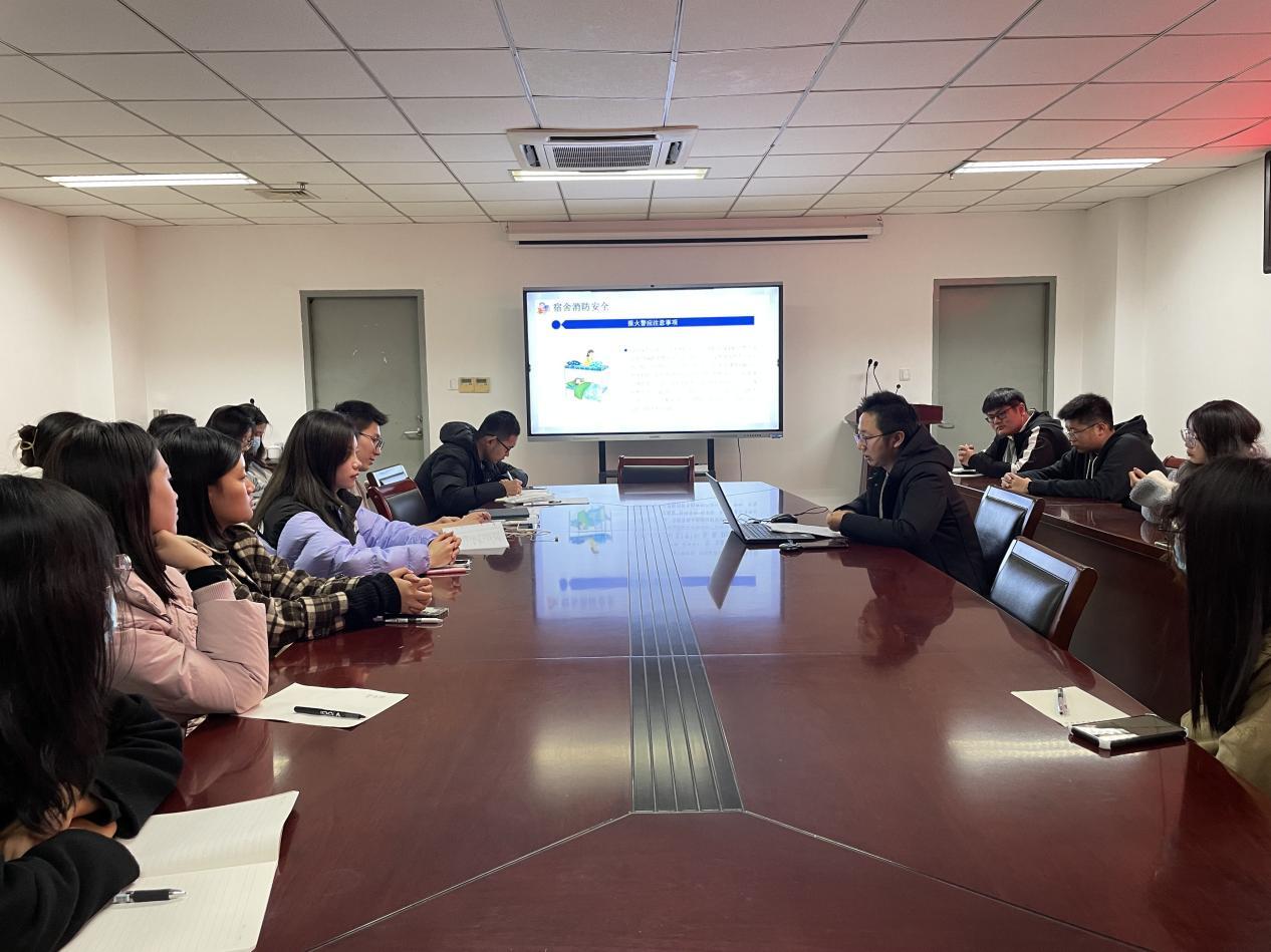 王彧老师首先强调宿舍是同学们生活与学习的重要场所,同时还是人员密集区域,需要所有同学去精心维护,一旦安全意识淡薄极易引发事故。随后,他指出了最主要的三个安全隐患:私拉乱接电线;使用酒精灯、打火机等明火;使用违章电器。接着,王彧老师讲解了消防安全十二口诀、防盗三大方法和公司内务评分细则,对参会同学进行宿舍消防、财产安全知识科普,同时强调了宿舍卫生治理。最后,王彧老师希望与会员工干部牢记工作职责,加强责任意识,以身作则做好宿舍安全管理工作。