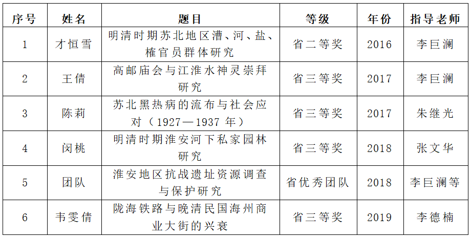 “十三五”期间获得江苏省本科优秀毕业论文团队1项、省优秀毕业论文二等奖1项、三等奖4项目;历史学专业获全国和江苏省师范技能大赛一等奖3项、二等奖7项、三等奖6项;旅游管理、酒店管理专业获“左岸杯”世界老员工品酒赛亚洲区冠军、全球第四,获全国旅游院校服务技能大赛团体一等奖1项、单项一等奖2项、单项二等奖5项、三等奖5项;社会工作专业获教育部教指委主办的社会工作调查技能大赛二等奖1项、优秀奖1项,其他市厅级奖励10余项,研究生考取率保持在35%左右。