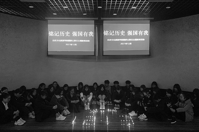 主题教育活动在烛光祭奠仪式中缓缓结束,同学们现场点燃红烛寄托哀思。数支红烛为30万遇难同胞而点亮,全体师生低头默哀,祈愿和平。