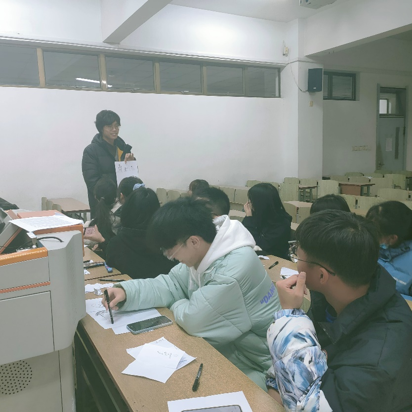 在每位同学都分享过之后,暖场活动结束,进入下一个环节“你画我猜”以画猜接龙的方式,由第一位同学根据题目作画,画完后交给下一位同学猜测画的题目,该同学猜完后再将猜测答案写在纸上交给下一位同学作画,以此类推直到最后一位同学猜测真正的答案是什么,结果往往与原题目差别不小,该活动让大家了解到沟通过程中可能发生很多差错,以生动有趣的形式让同学们了解到有效沟通、正确沟通的重要性。