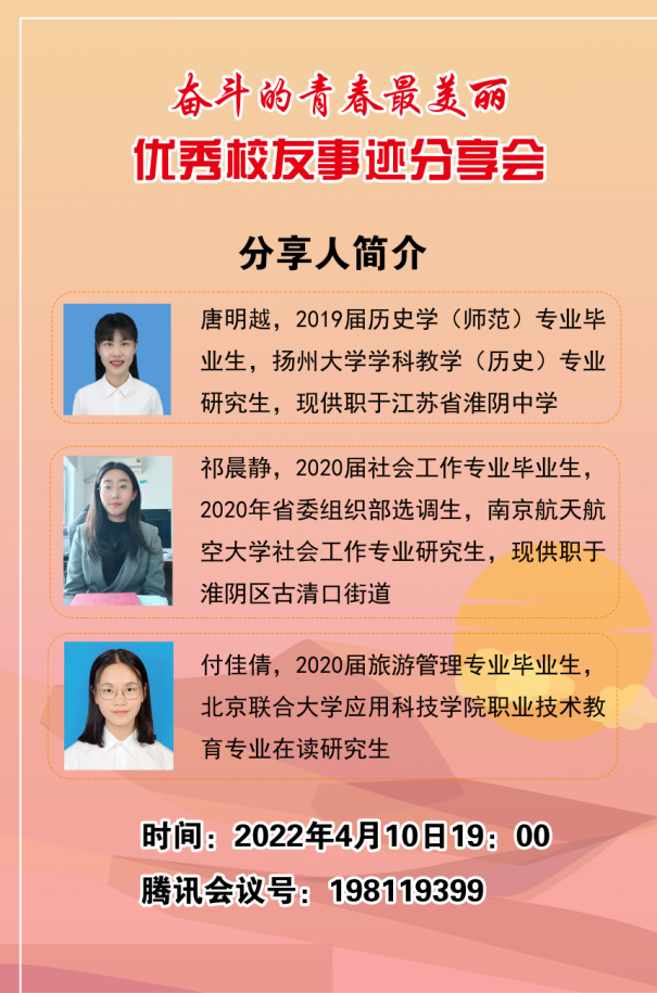 4月10日19:00,EVO真人视讯在长江路校区弘文楼1-612举办“奋斗的青春最美丽”优秀员工事迹分享会。唐明越、祁晨静、付佳倩三位优秀员工通过线上会议的形式与同学们分享学习、工作的经验与感悟。员工代表在会议室现场参与了活动,300余名员工通过线上方式参与活动。