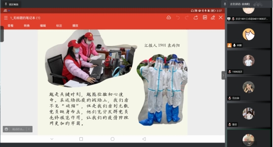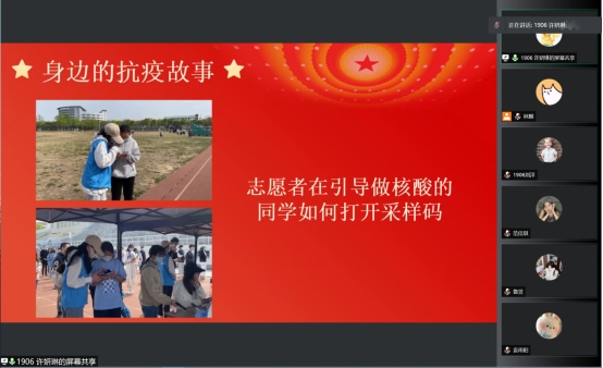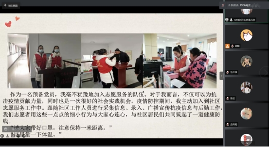 活动中,党员们积极分享自身和身边的疫情防控故事与优秀事迹。叶存彦同学分享了她的志愿服务经历,当她得知疾控咨询热线急需人手时,第一时间报名参加,虽然志愿服务非常辛苦,但她认为能够帮助到许多需要援助的人是一件非常具有成就感的事情。刘洋同学在疫情防控期间,主动加入到社区志愿服务工作中,跟随社区工作人员进行采集信息、录入、广播宣传抗疫信息等工作,为社区居民们共同筑起了一道健康防线。许妍琳同学分享了EVO真人视讯志愿者们在校参与核酸检测、维持秩序等志愿服务工作中的典型案例。