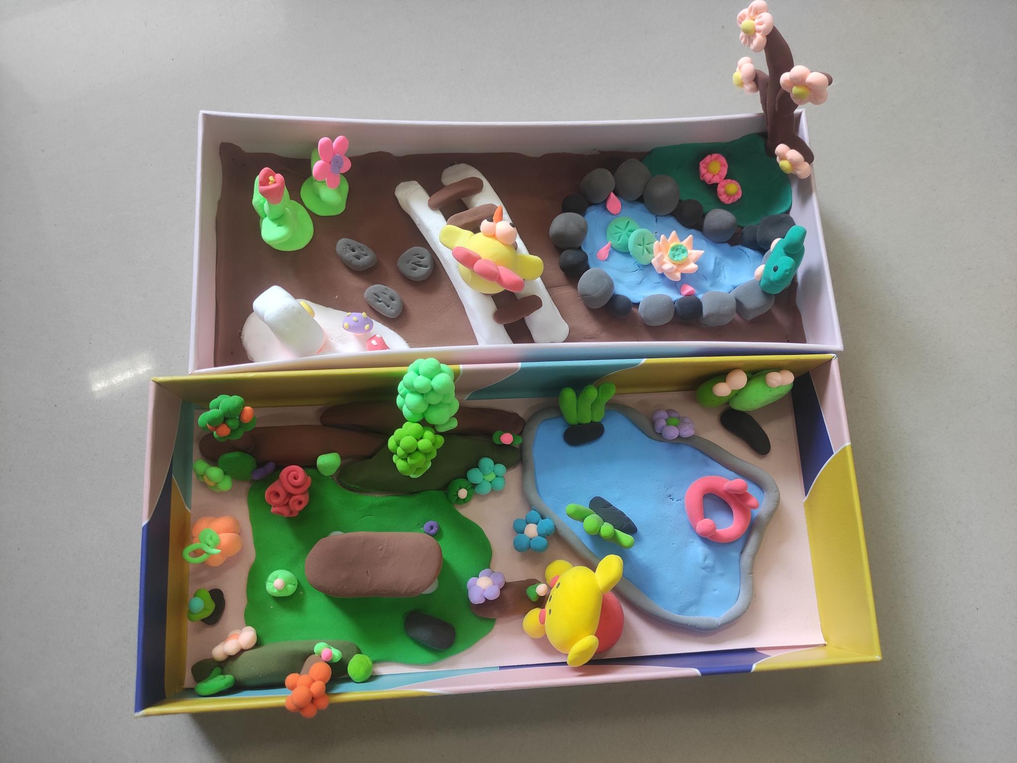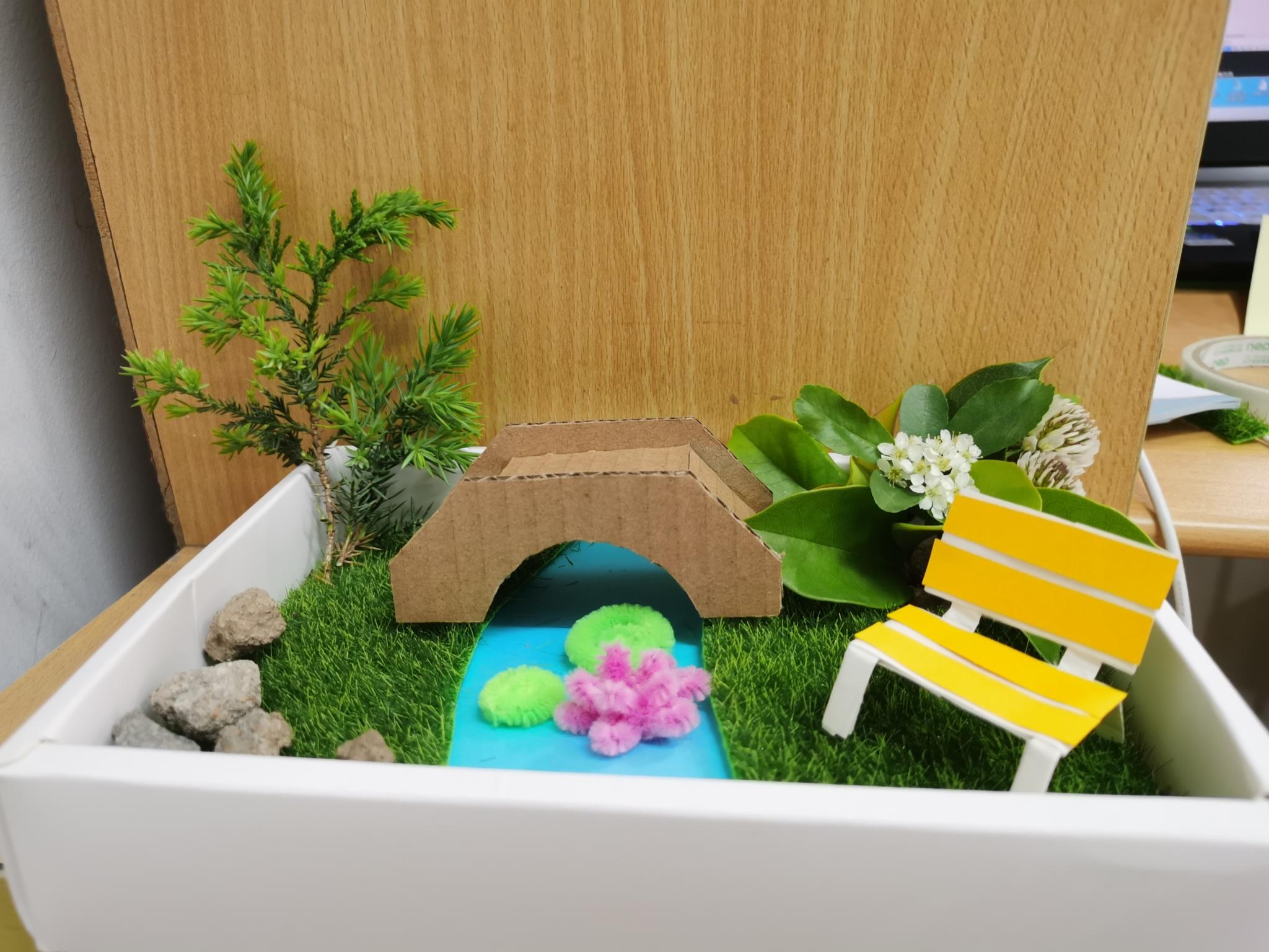 活动分为两个阶段——制作阶段和交流阶段。在制作阶段中,同学们积极参与,通过手工制作微型景观的方式,用心设计并创作精美别致、意境深远、各具特色的校园指尖美景。“宁静的午后,阳光透过树荫,斑驳点点,镌刻初夏的印记”——这是2105班陈锦的感悟,她用彩色橡皮泥制作出镜月湖宁静、秀丽的风景图。2003班顾晨巧用彩纸、树叶勾勒出7号楼宿舍前的小桥流水。同学们精心设计富有创意的校园一角,如教学楼、操场、图书馆及周边植物等微景观。