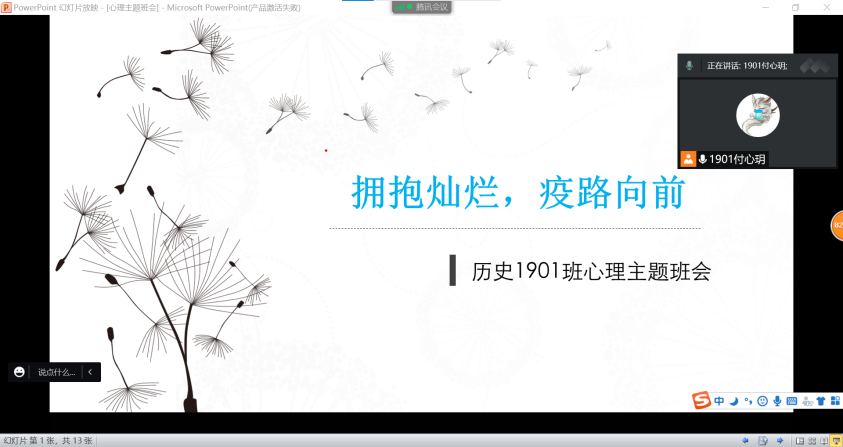 为帮助同学们积极面对疫情以及考研、考编带来的心理负担,5月14日晚,历史1901班于腾讯会议举办了一场线上心理班会。活动由心理委员王兆龙、付心玥主持,全体1901班同学线上参与。