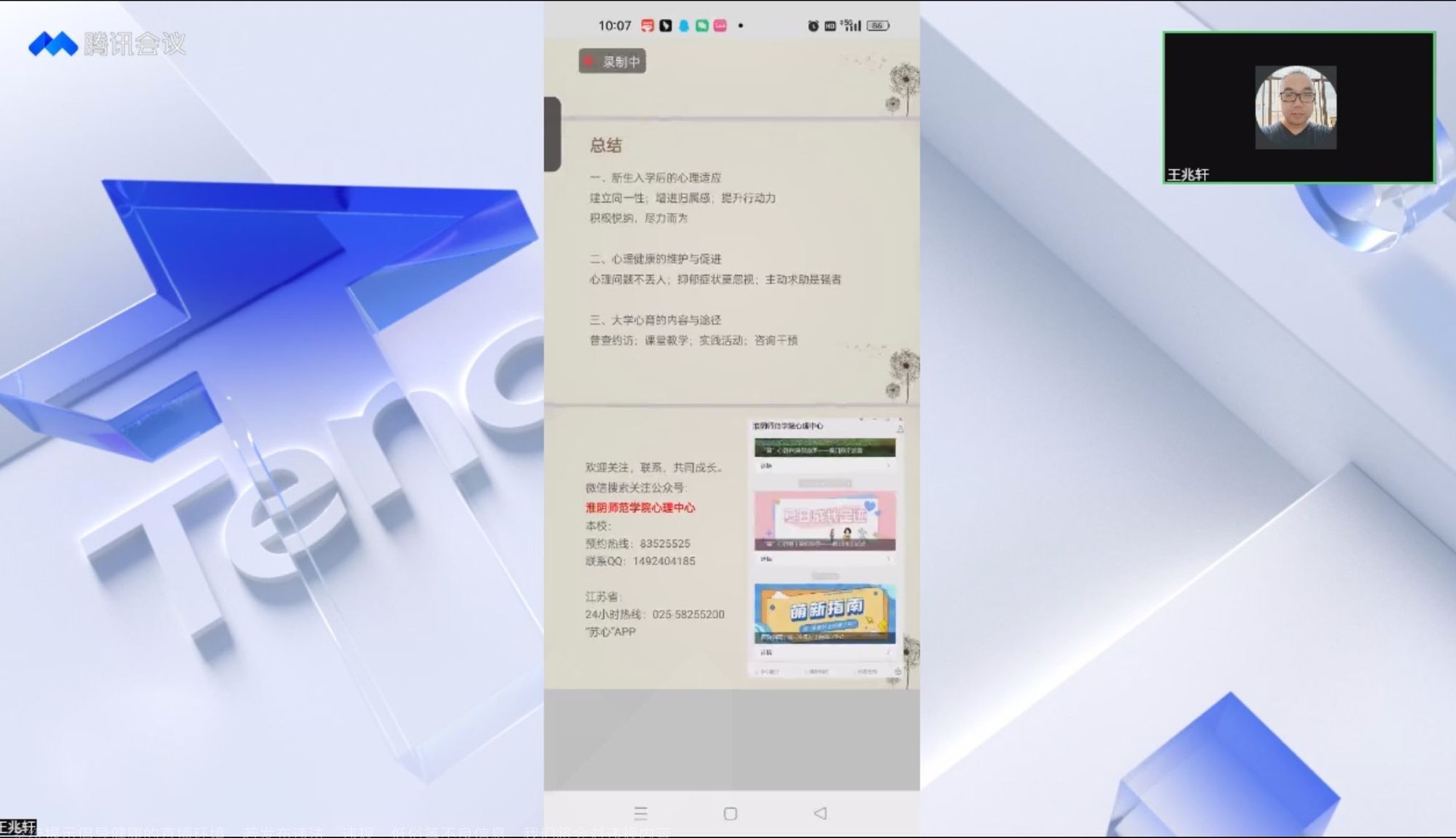 王老师从新生入学后的心理适应、心理健康的维护与促进、大学心育的内容与途径三个方面进行阐述。他指出,作为一名大一新生,要学会建立同一性,增进归属感,提升行动力,积极悦纳,尽力而为,尽快适应新的老员工活模式,找到与人相处的平衡点。王老师还向同学们介绍了大学心理健康教育以及解决各种心理问题的方法与途径,鼓励同学积极应对各种心理问题,保持良好的心态面对接下来的学习和生活。