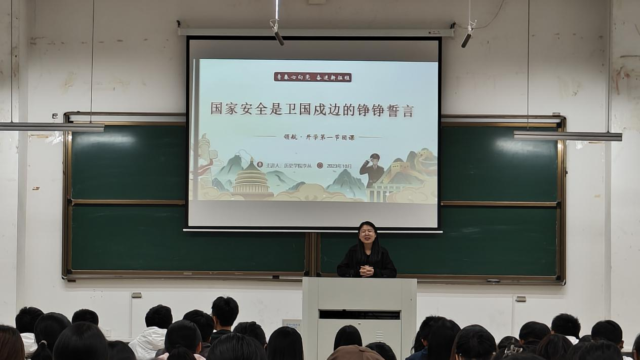 李丛老师从2020年中印边境冲突事件切入,通过三个问题引发同学们对国家安全问题的思考,并介绍了陈祥榕等戍边英雄的事迹,呼吁大家“安而不忘危,存而不忘亡,治而不忘乱”,保持清醒头脑,增强忧患意识。此外,她还带领大家一起回顾了共青团的光辉历史,勉励同学们坚定理想信念,不忘入团初心。