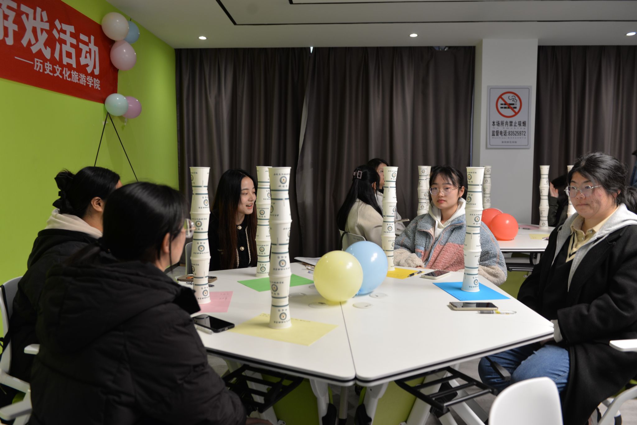活动中,同学们分成了五个小组,设置了三个游戏环节,分别是“下沉的船”“叠杯塔”和“变形虫”。“下沉的船”环节,同学们积极讨论,现场氛围热烈,展现了每个人出色的思维能力;“叠杯塔”环节,小组成员默契配合,高度专注,叠起了一个又一个杯塔,展示了团队的凝聚力;“变形虫”环节,小组成员们在蒙眼情况下,通过合作将绳子拉成指定形状,展现了团队的应变能力。