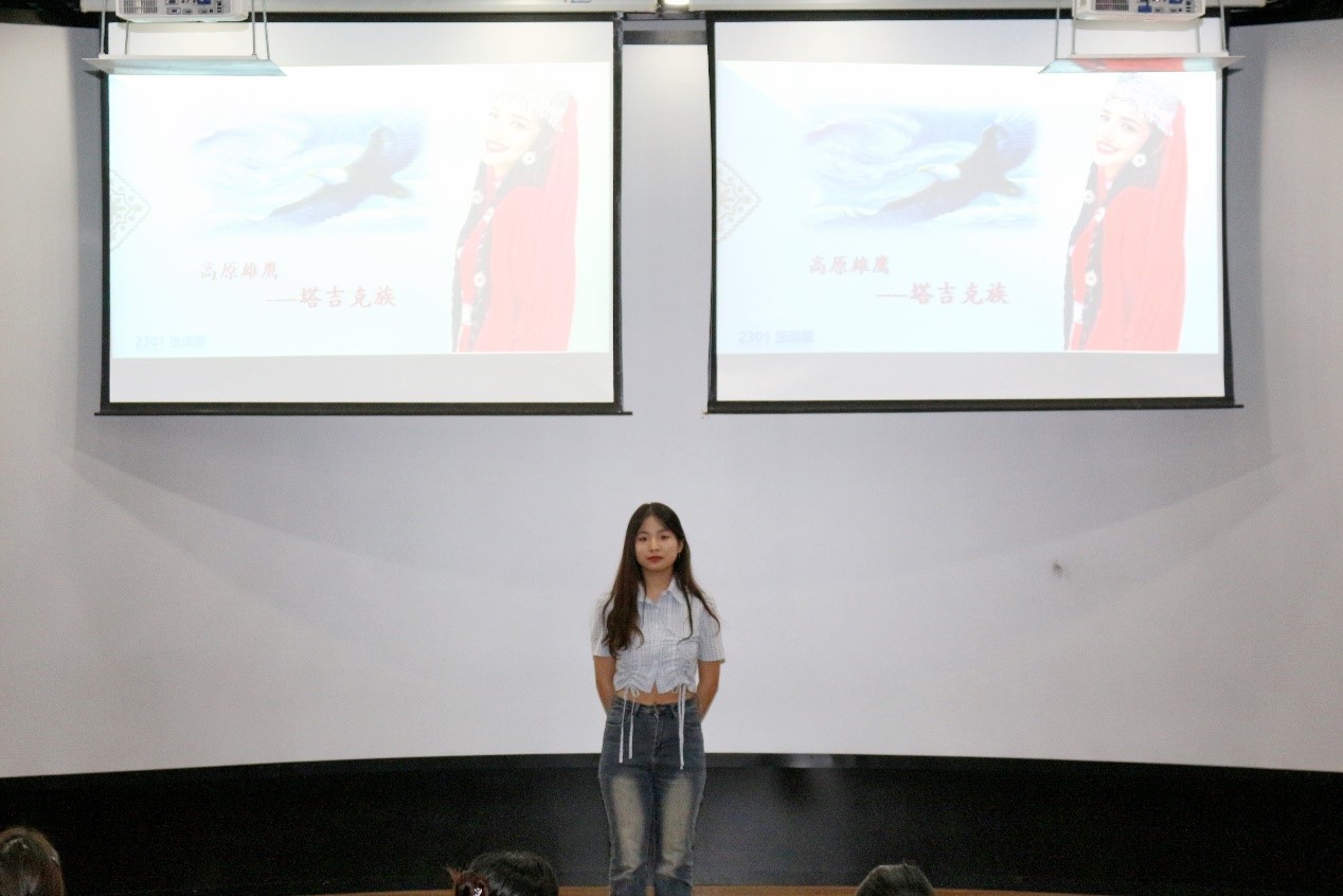 活动现场,少数民族员工代表各展所长,通过演讲、歌唱、手工艺品展示等载体,生动地展现了民族特色文化。布依族韦婉婷同学,以服饰为切口,向大家介绍了布依族服饰特征,讲述了布依族的生活习惯和思想观念,增强了同学们对布依族的了解。周晓旭同学结合图片,着重介绍了维吾尔族的艾德莱斯裙,向大家充分地展示了维吾尔族服饰的美,以及蕴藏在服饰背后文化。来自土家族的夏彬冰同学配以视频演唱了一曲《南山南》,用动听的歌声带领大家领略了民谣之美。郭童欣、陈瑞琪同学则带来了自己所做的手工艺品,并向同学们介绍了手工艺品的制作方法和其中蕴含的民族团结的深刻寓意,传递出中华儿女应永远携手前行,共同创造美好未来的美好愿望。参赛选手们以自信大方的姿态和真挚的感情充分展示了自己对于促进民族团结和社会进步的坚定信念和责任感。