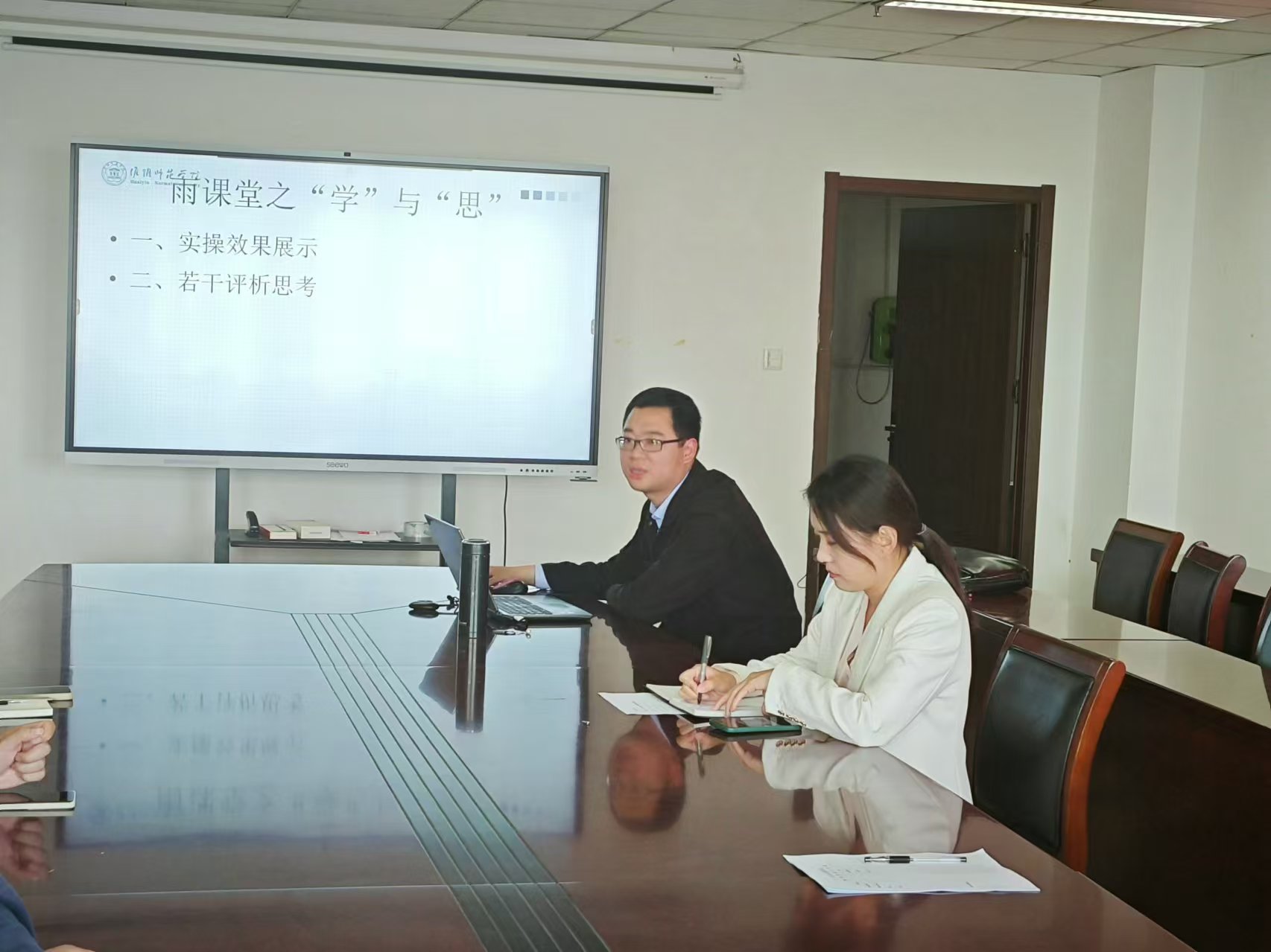 图为王燕老师分享现场 记者刘玘王胜围绕雨课堂的教学实践,分享了智慧化教学在课程建设、课堂管理、员工评价等方面的实际效用,以此推进了混合式教学、翻转课堂建设。