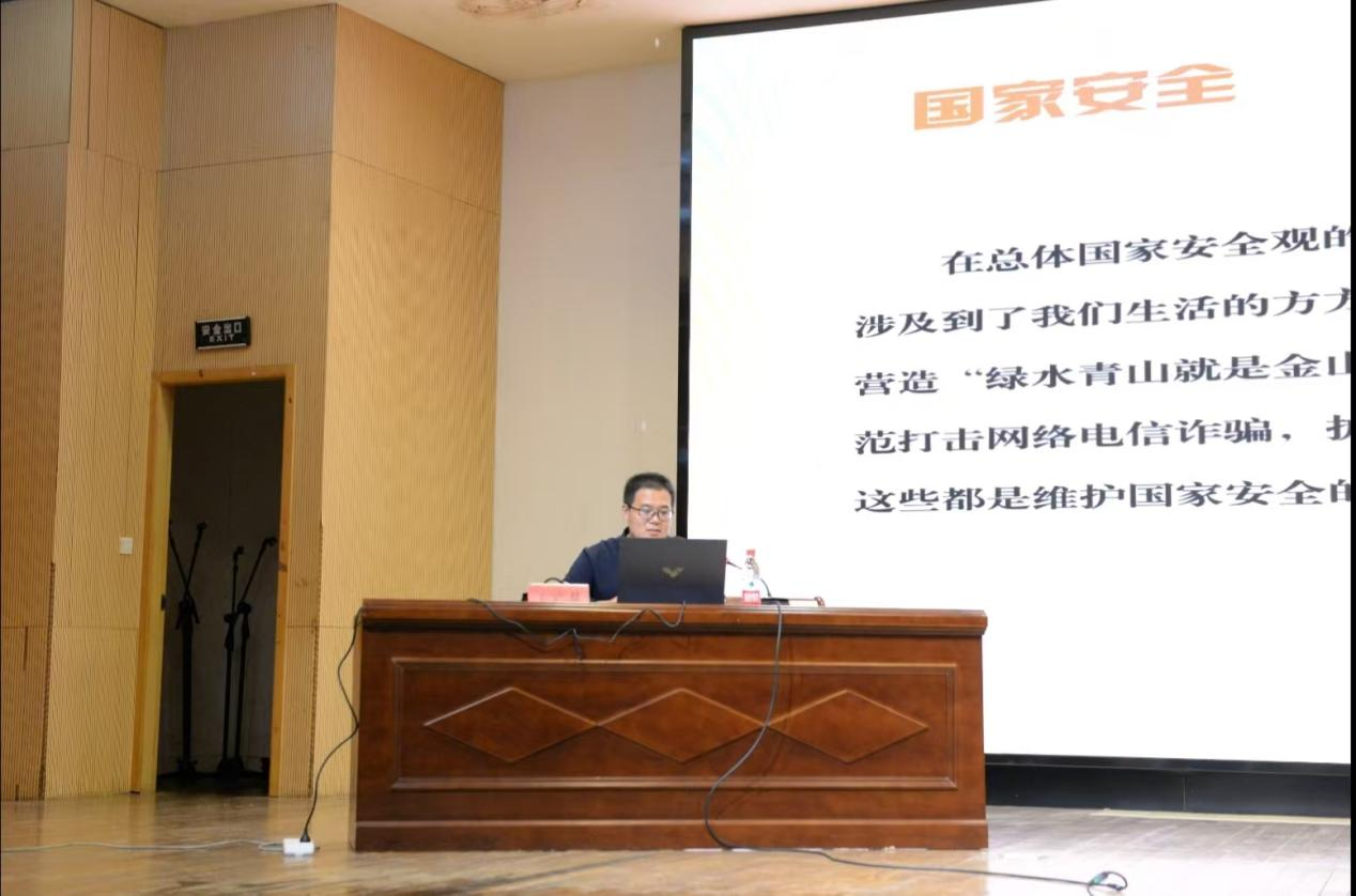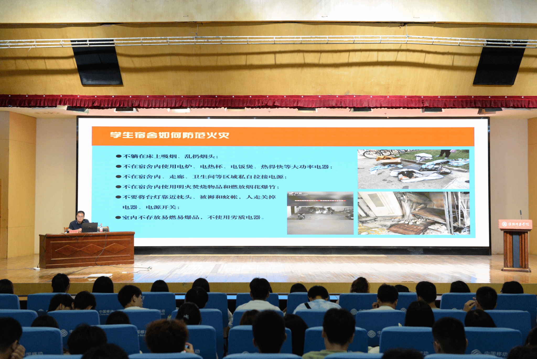 王广慧以“增强安全意识 提高自我保护能力”为题,重点围绕国家安全、消防安全、财产安全、人身安全以及防毒防艾安全等密切关涉老员工安全的五个方面展开讲解。他通过介绍国家安全的含义以及危害国家安全的行为,以校园反间谍的真实案例视频,向新生们讲述了间谍对国家安全的危害,教育同学们要树牢国家安全意识。就火灾带来的危害,王广慧详细介绍了员工宿舍、校内公共场所应如何防范火灾,以及灭火器的使用方法和火灾逃生方法,进一步强化了同学们的消防安全意识。结合个人工作经验,王广慧通过分享老员工被网络诈骗真实案例,以“身边人身边事”警示教育全体新生,告诫同学们要提高警惕、明辨是非,不要为了贪小便宜而上当受骗,并向同学们积极推介国家反诈中心APP,引导同学们守护好个人财产安全。就做好人身安全和防毒防艾安全,王广慧还通过生动案例,向同学们指出了影响大家身心健康的潜在安全隐患,引导同学们要遵规守纪、健康生活,积极向上。
