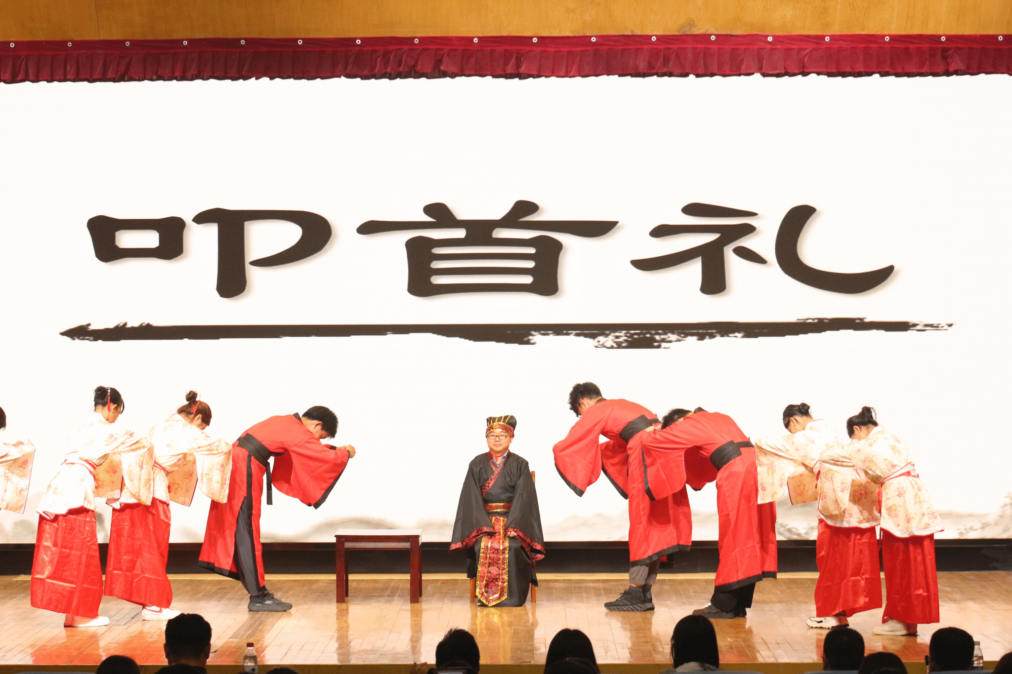 举行2024级新生行拜师礼仪式。新生代表与教师代表身着古装,生动演绎了古人拜师求学需经历“正衣冠、盥手礼、叩首礼、束脩六礼、弟子敬茶、聆讯、礼成”的完整礼仪过程,教育引导同学们在未来学习生活中心怀感恩、虚心聆听老师教诲,学业有成。