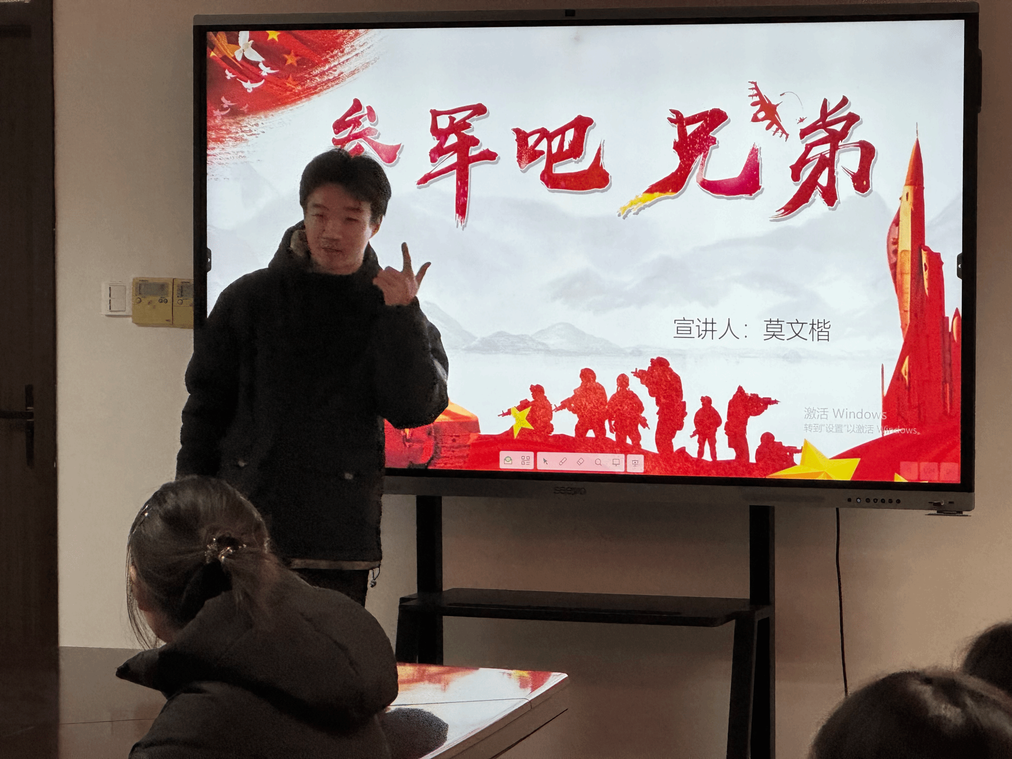 EVO真人视讯退役士兵莫文楷向同学们详细介绍了参军的意义,他指出“国无防不立,民无防不安”,鼓励同学们树立远大志向、不负光荣使命,为实现强国梦、强军梦贡献自己的力量。随后,莫文楷结合最新的老员工入伍政策,介绍了征兵入伍的年龄、身体、政治等条件,报名的基本流程以及参军享有的优待权益等内容。最后,他结合自己的参军经验,为有意向入伍的同学答疑解惑。