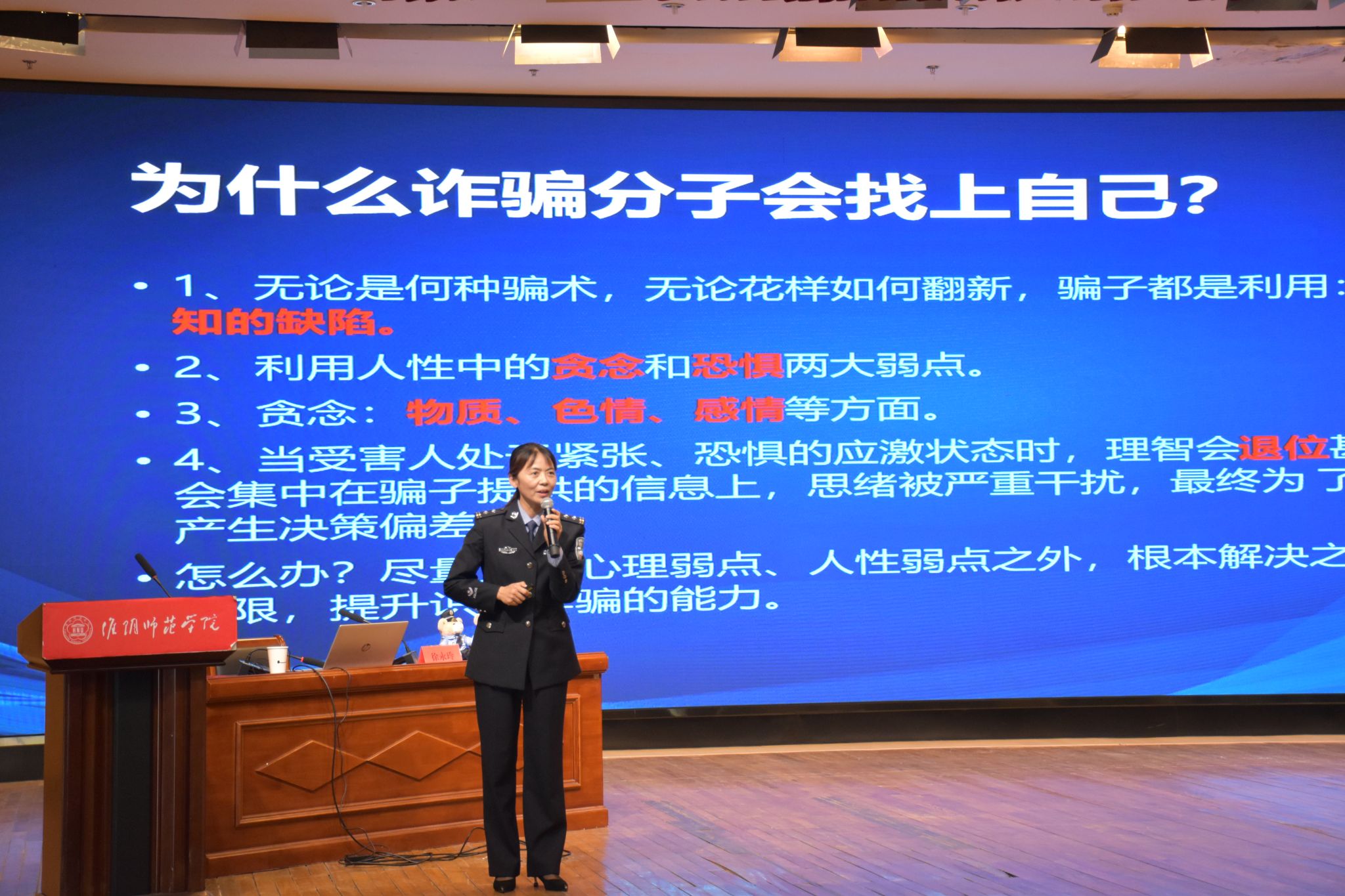 徐永玲结合多年防诈工作经验,围绕“电信诈骗”主题,从“为何诈骗分子会找上自己”和“常见电信网络诈骗手段解析”两大议题展开系统讲解。她指出:“人的一生都在为自己的认知买单,诈骗分子往往会利用‘人性的弱点+认知的缺陷’实施骗术。”通过真实案例分析,徐永玲重点剖析了“刷单返利”“冒充公检法”“冒充领导熟人”等典型诈骗套路,并详细讲述了近期发生的老员工被诈骗案件细节。她警示同学们:“陌生电话不要接,陌生短信不能信,陌生链接不能点,转账汇款必核实。”