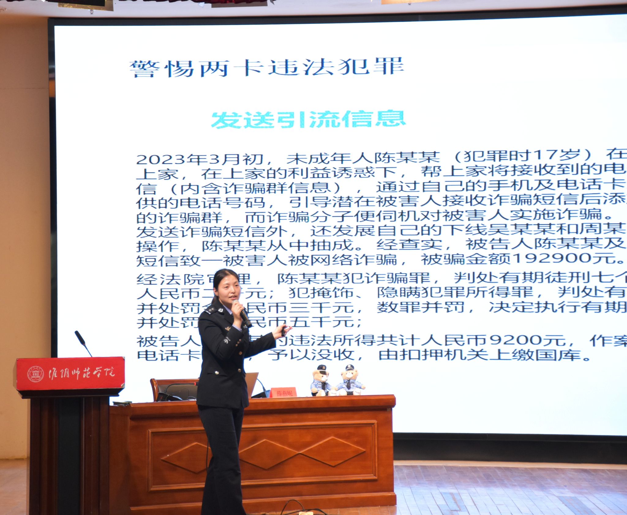 薛燕妮则从微观层面切入,聚焦“警惕‘两卡’违法犯罪”问题,通过贴近生活的案例、法律分析及数据可视化呈现,层层深入地讲解了“两卡”犯罪的危害与防范措施。她重点普及了“法律责任”“信用惩戒”“加大审核”“业务限制”四个维度的惩戒措施,并结合《中华人民共和国刑法》《反电信网络诈骗法》等法律法规进行深度解读。薛燕妮特别提醒同学们:“要保护好个人信息,妥善保管身份证、手机、银行卡等账户存储工具,及时注销不用的电话卡和银行卡。”