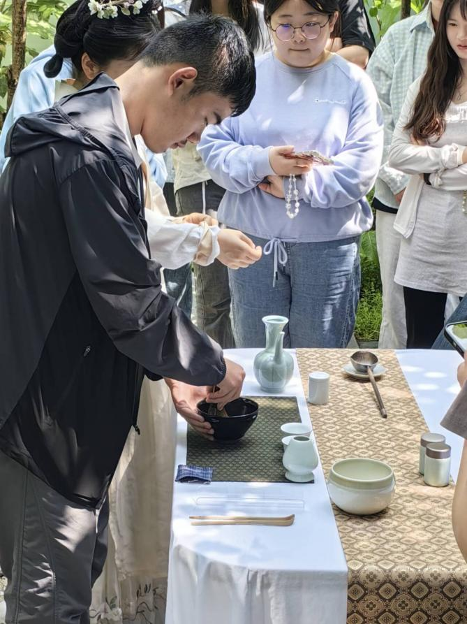 然后进行了“茗香雅集”宋代茶艺体验活动。同学们在工作人员的带领下沉浸式感受到了宋人饮茶的风雅意趣,不少同学成功打出了丰厚的茶沫,还兴致盎然地在茶汤表面尝试作画。茶香袅袅间,同学们仿佛穿越千年,与宋代文人雅士共赴一场茶宴,真切体会到了宋人饮茶过程中蕴含的审美情趣与生活智慧。