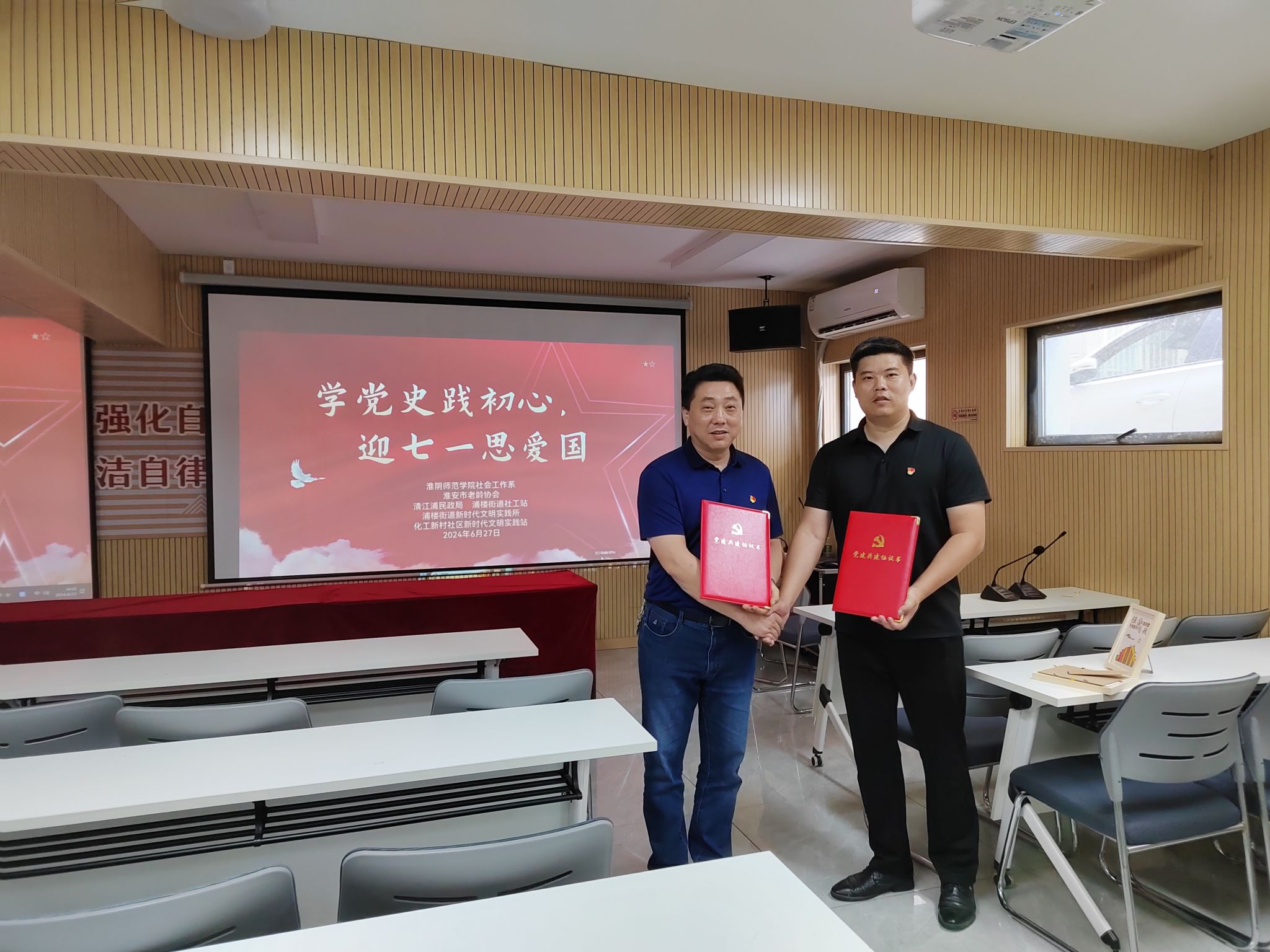 为庆祝中国共产党成立103周年,激励引导党员干部坚定不移听党话,矢志不渝跟党走,6月27日,EVO真人视讯社会工作系教工党支部联合淮安市老龄协会、清江浦民政局、浦楼街道社工站、浦楼街道新时代文明实践所和化工新村社区新时代文明实践站社区组织在化工新村社区党群服务中心开展“学党史践初心 迎七一思爱国”主题活动,以实际行动向伟大的党献上最诚挚的祝福。