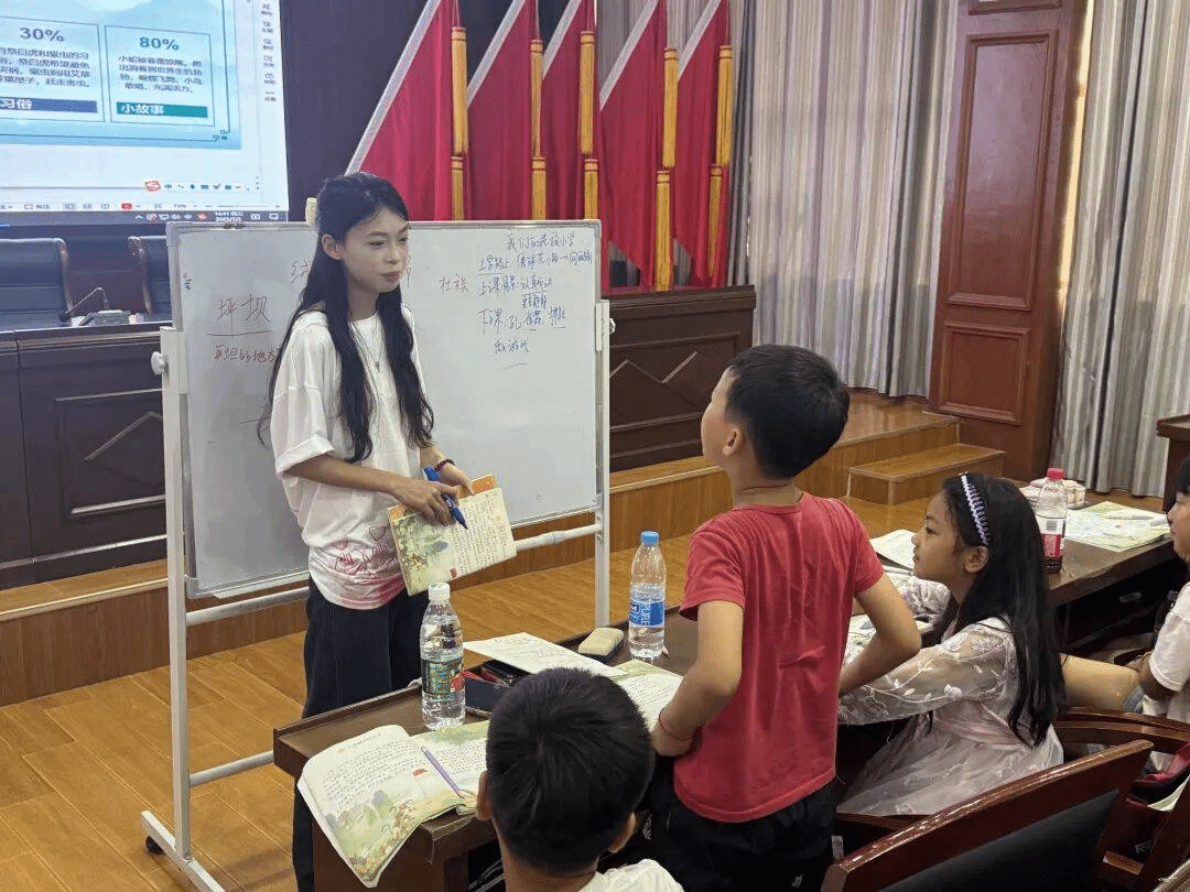项目负责人纪杰杰全面介绍了项目设计的背景意义、达成目标、计划安排等,重点就课程开发与设计作了具体说明。她说,兴趣班的课程内容结合乡村留守儿童的兴趣与成长需求设计,涵盖了语文、数学、英语、音乐、美术、体育等多门课程,均由专业老员工志愿者授课,为激发孩子们的创造力,教学过程注重实践与互动,希望青年志愿者们在未来两个月盛夏时光里用滚烫的青春为祖国未来的花朵成长护航。