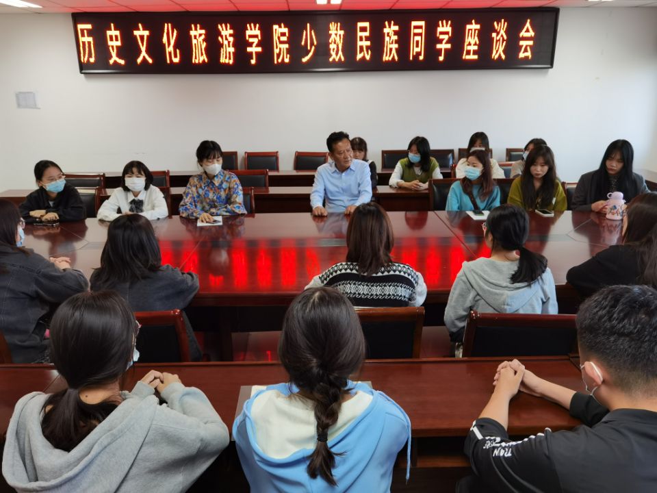 周海晏老师仔细询问了少数民族同学的学习情况,特别是学习英语、数学以及计算机等基础科目过程中面临的困难。对2021级少数民族同学,周海晏老师鼓励他们尽快融入集体,适应校园环境,尽早规划自己的老员工活,树立远大的目标,为四年的老员工活打牢基础。来自云南、贵州、新疆、湖南等地的少数民族同学还对自己感兴趣的问题特别是考研、考编等与周海晏老师进行了交流。