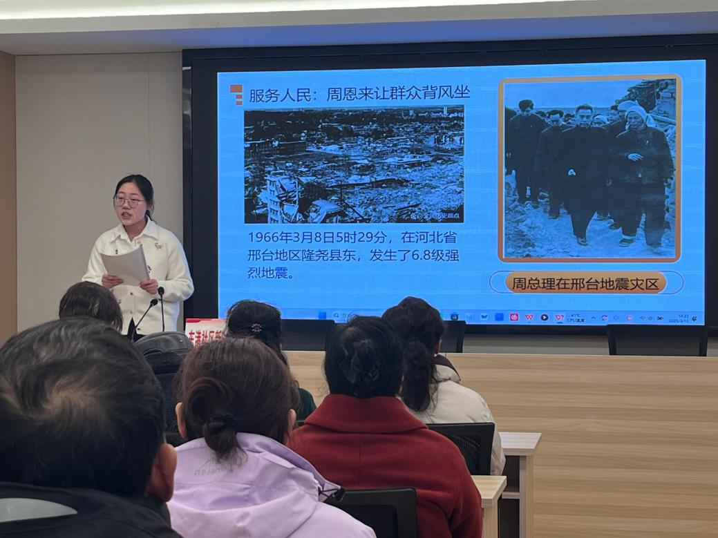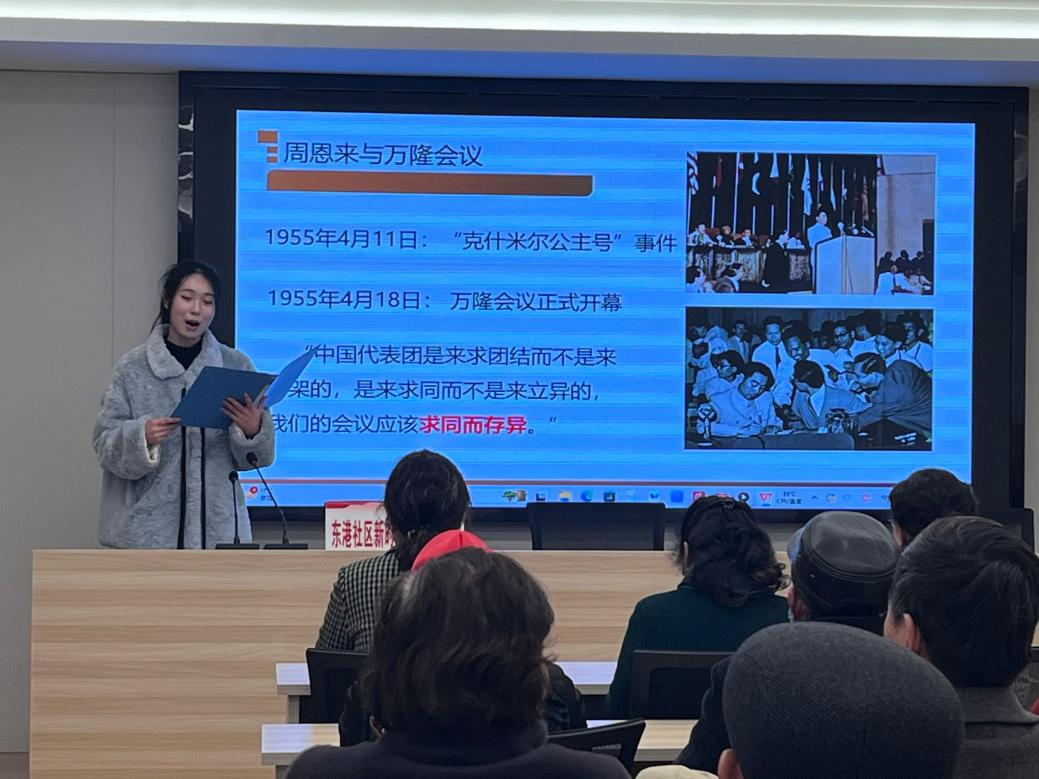 宣讲员尹秋雨讲述周恩来13岁在沈阳东关模范公司立下“为中华之崛起而读书”的志向,强调其少年时期的家国情怀。老人感慨:“总理年少时就胸怀大志,是我们青年人的榜样。”宣讲员通过很多小故事向社区老人们介绍了周恩来总理全心全意为人民服务,严于律己、廉洁奉公,求真务实、脚踏实地,团结同志的无私奉献、艰苦奋斗的精神。