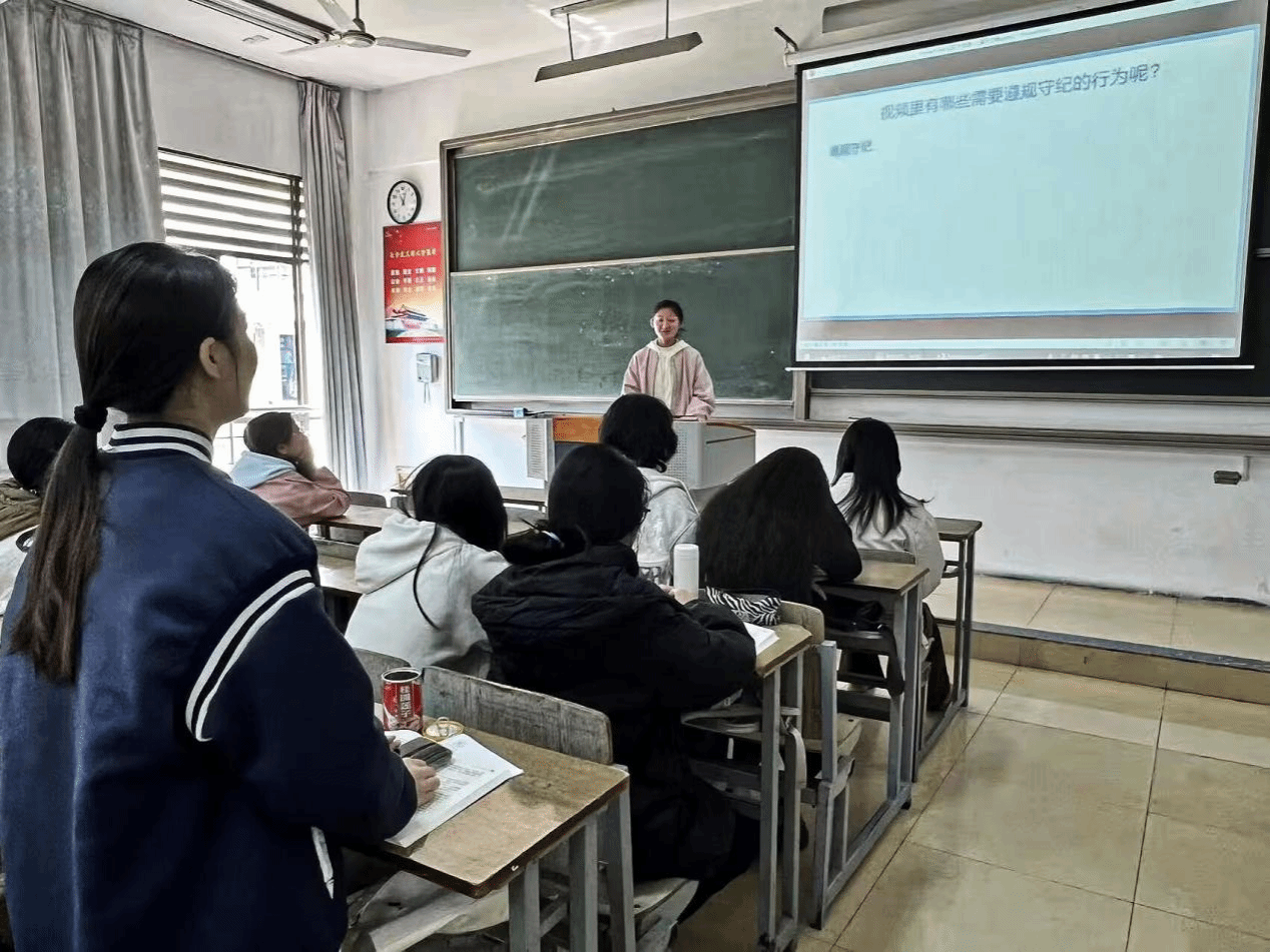 班会伊始,团支书通过播放精心挑选的视频,生动展示了校园规则的丰富内容,并发起提问,引导同学们积极思考,加深对校园规则的理解与记忆,为后续学习奠定良好基础。