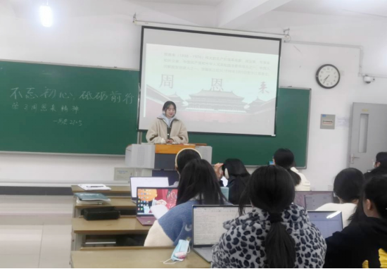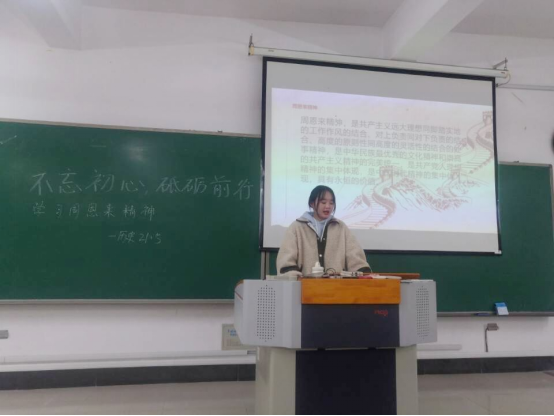 团支书李子妍同学带我们回顾了周总理一生,同时向我们细致的剖析了周恩来精神的内核以及周总理身上的人格魅力。鼓励我们隔着岁月的长河,跨越不同的时代,伟大的事业仍需要伟大的精神,伟大的精神需要后代的传承。