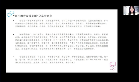 为了深入学习贯彻习近平新时代中国特色社会主义思想,引导全体同学树立正确的世界观、人生观、价值观,为“中国梦” 的实现而发奋学习、不懈奋斗。4月12日晚,历史2003团支部在线上召开“奋斗的青春最美丽”分享会,全班同学积极参与。