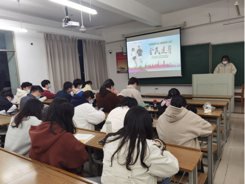 团支书姚硕先向大家介绍了如何合理膳食,以合理膳食“十”个字、中国居民平衡膳食“宝塔图”等生动形象地让大家了解了平时生活中应该如何吃好,养成健康的饮食习惯。接着由宣传委员季越从千步是把尺,活动有度量;内容任选泽,追求在万步;循序加时间,渐进增步速三个方面向大家介绍了适量运动的内涵。