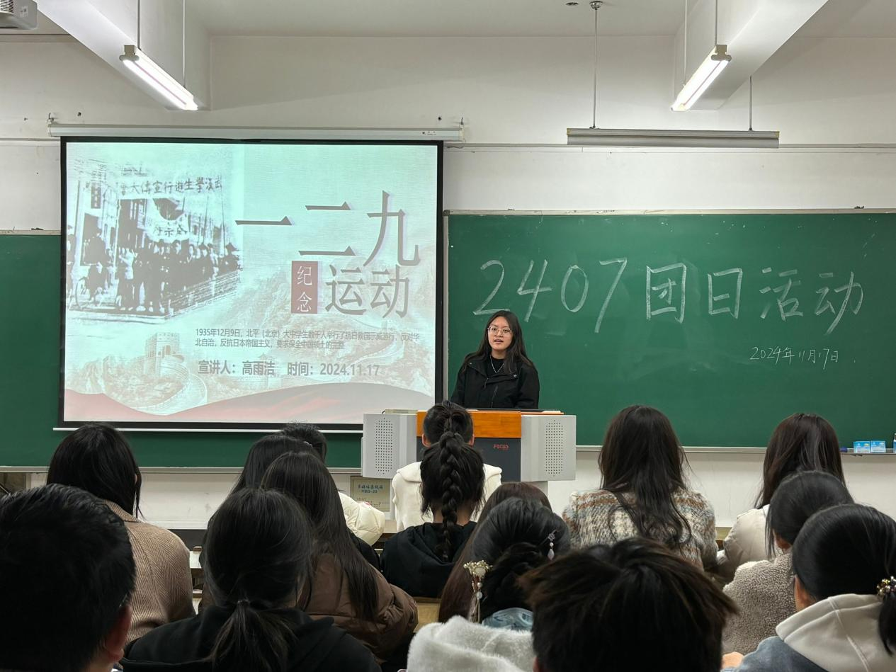 团日活动还设置了爱国诗歌朗诵环节。同学们声情并茂地朗诵,激昂的声音在空气中回荡,将爱国之情传递到每一个角落。此外,关于“一二·九”运动的知识竞赛更是将活动推向高潮,大家踊跃抢答,在作答中加深了对这段历史的认识。